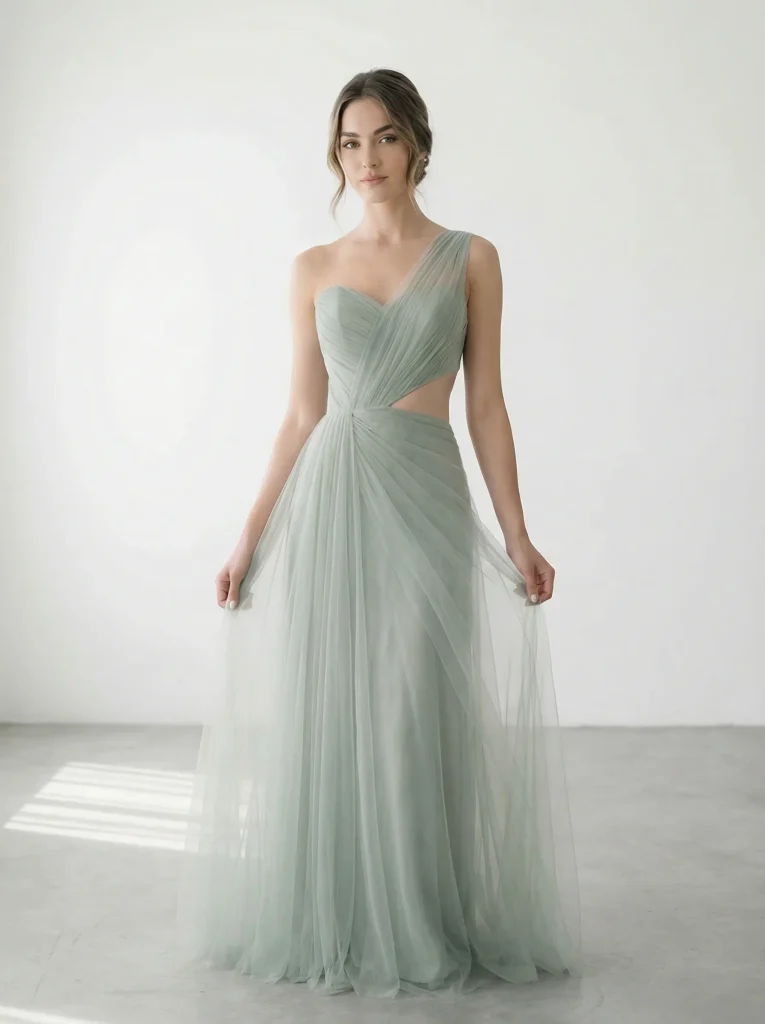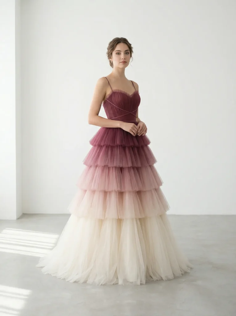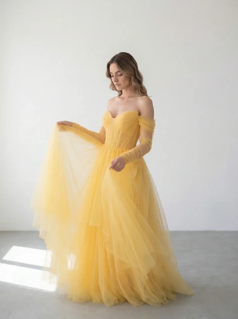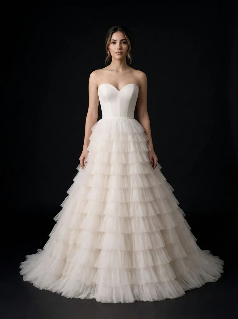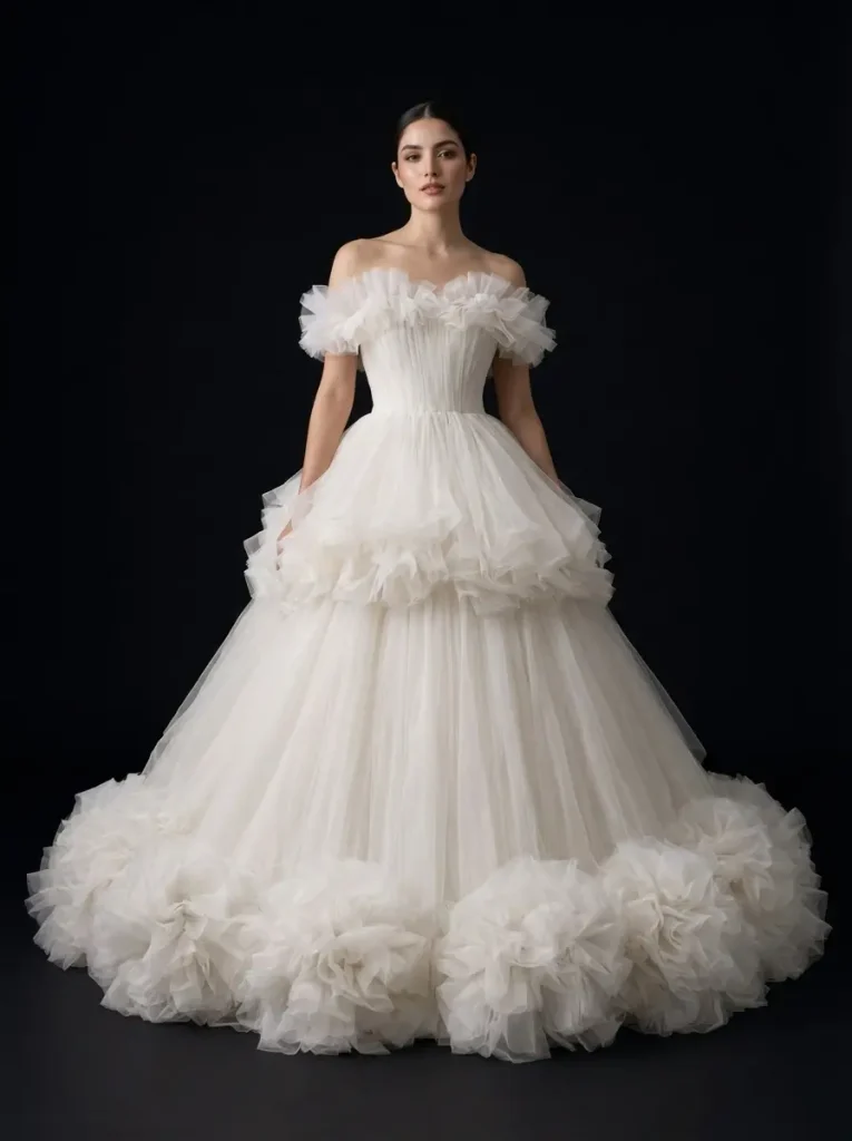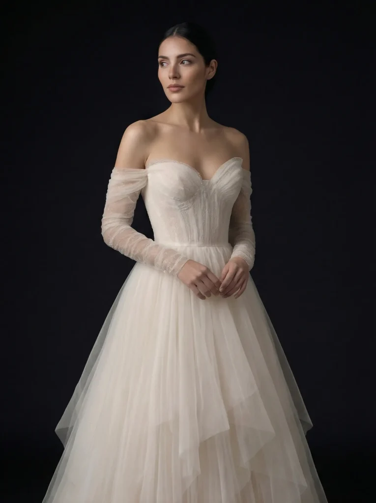 La evolución del diseño estructural aplicado a vestidos de Gala. Siluetas definidas, volumetría controlada y textiles europeos como el tul de alta calidad se integran para crear piezas con presencia escultural y movimiento etéreo.