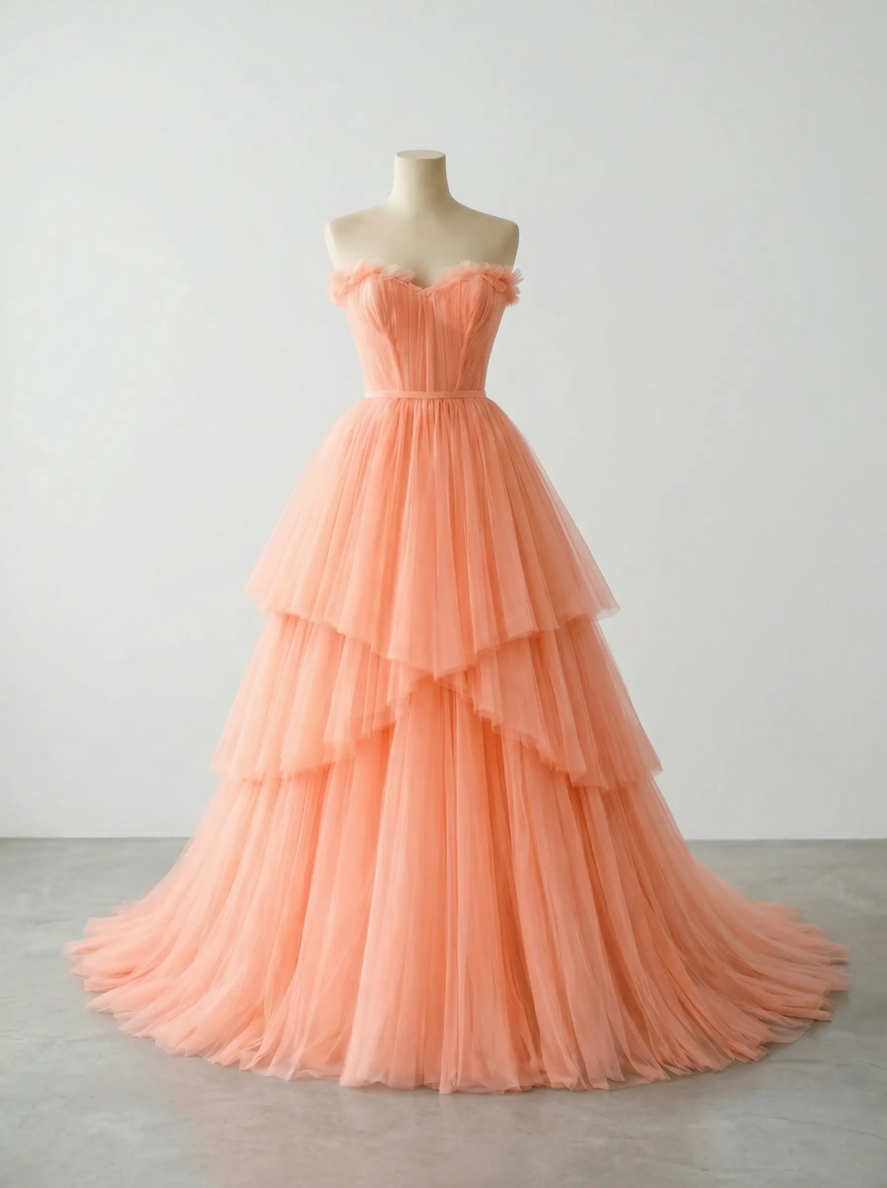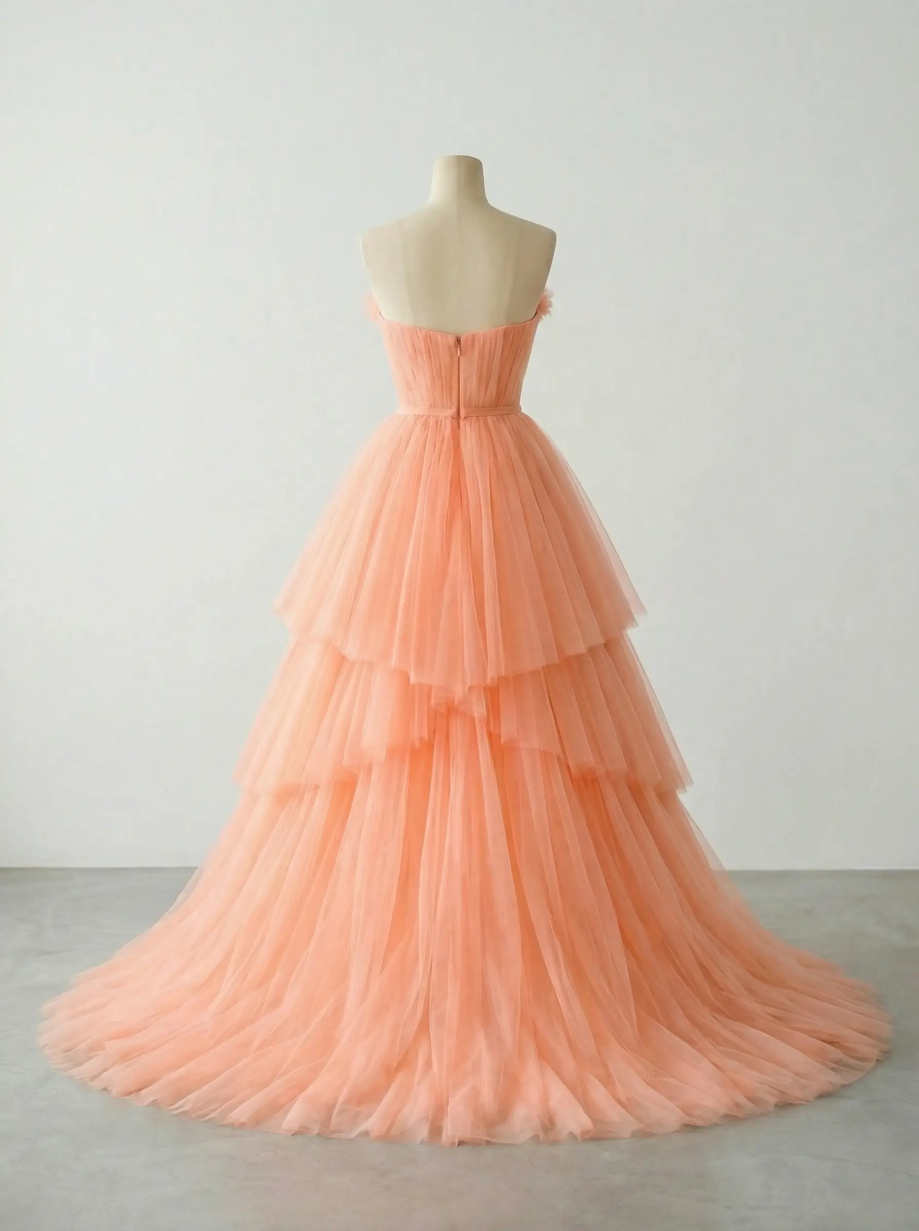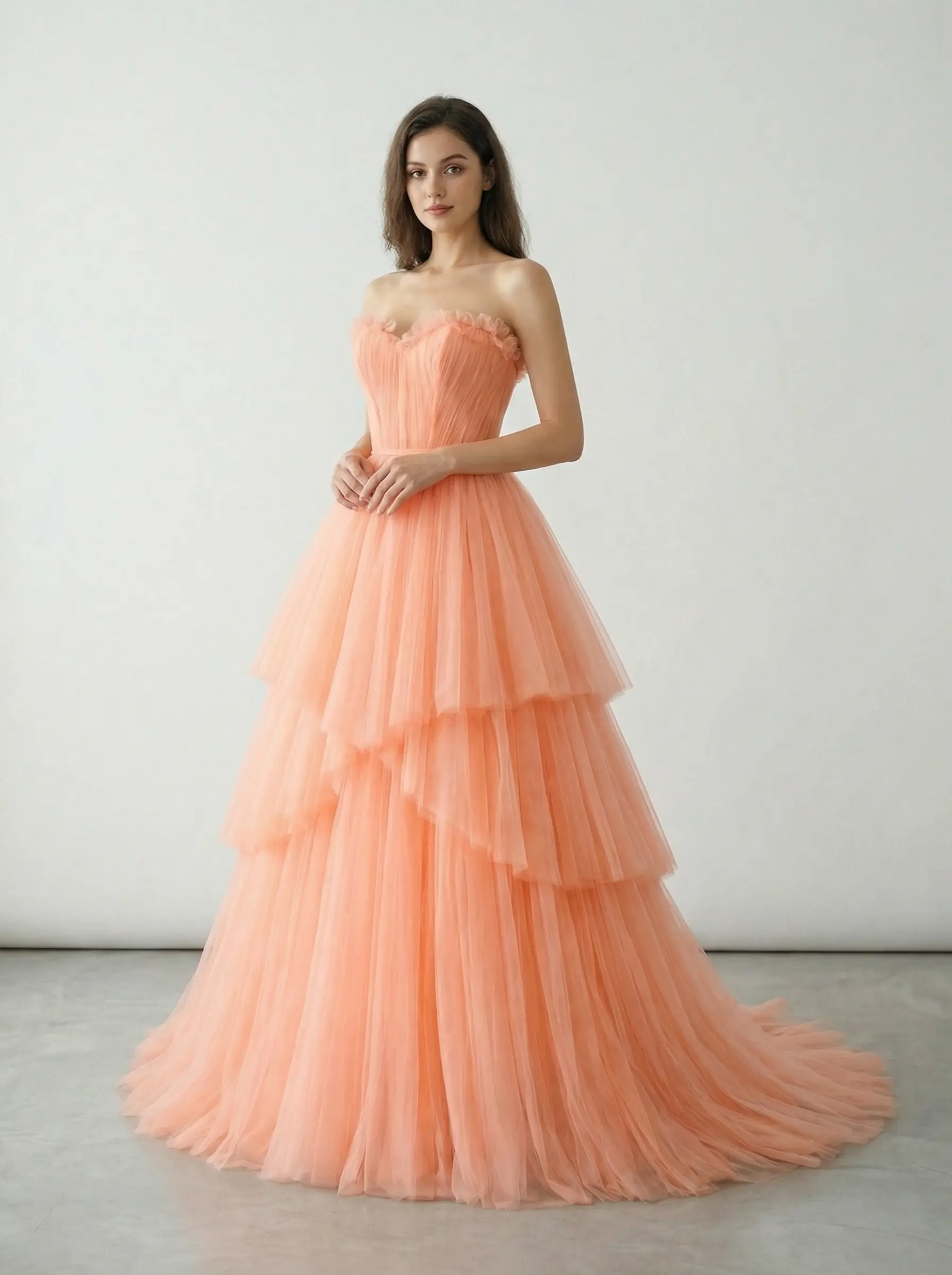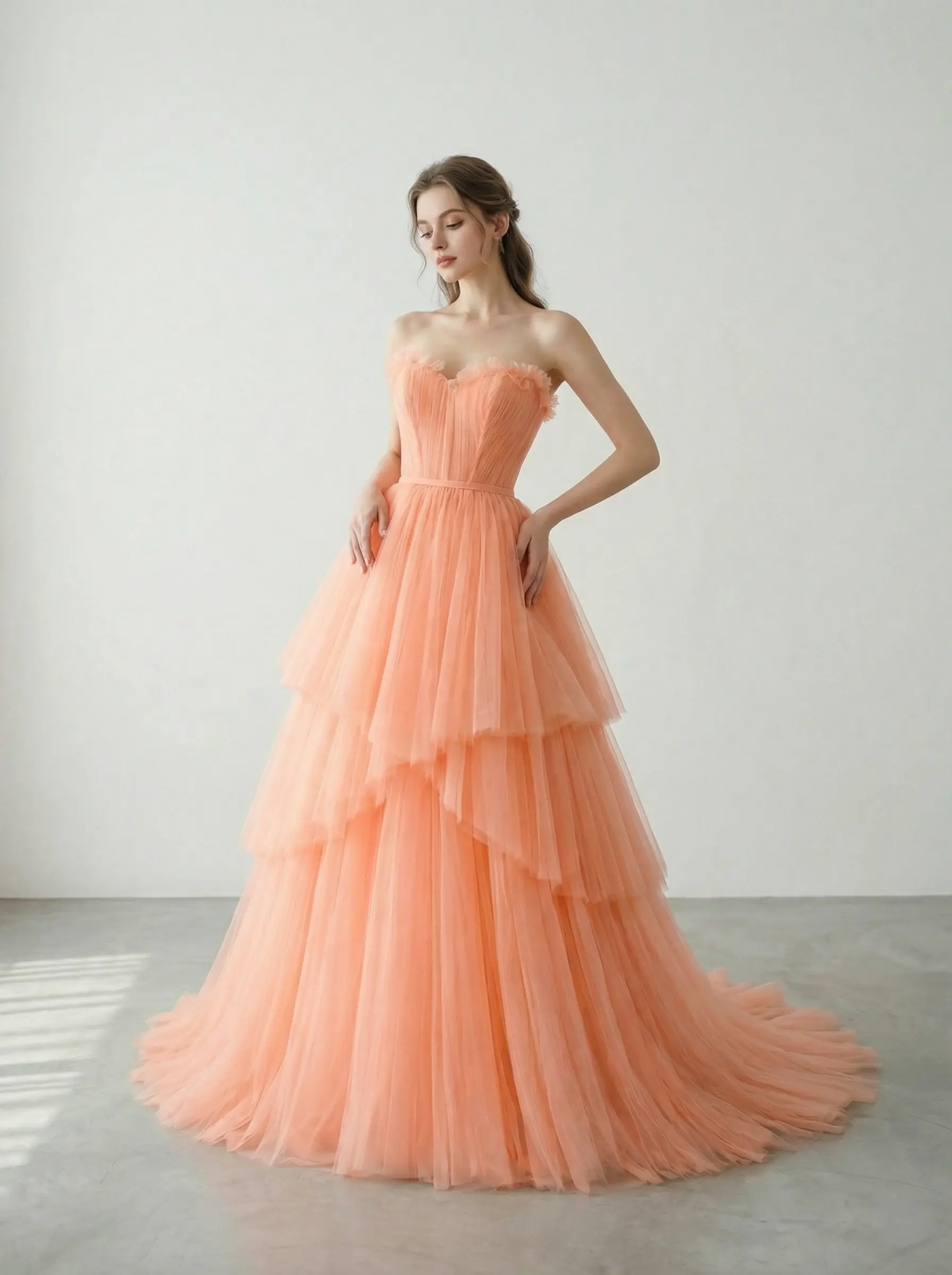 Vestido en tono durazno suave con corset estructurado y falda de tul en capas escalonadas que aportan volumen ligero y movimiento etéreo, diseñado para una entrada memorable.