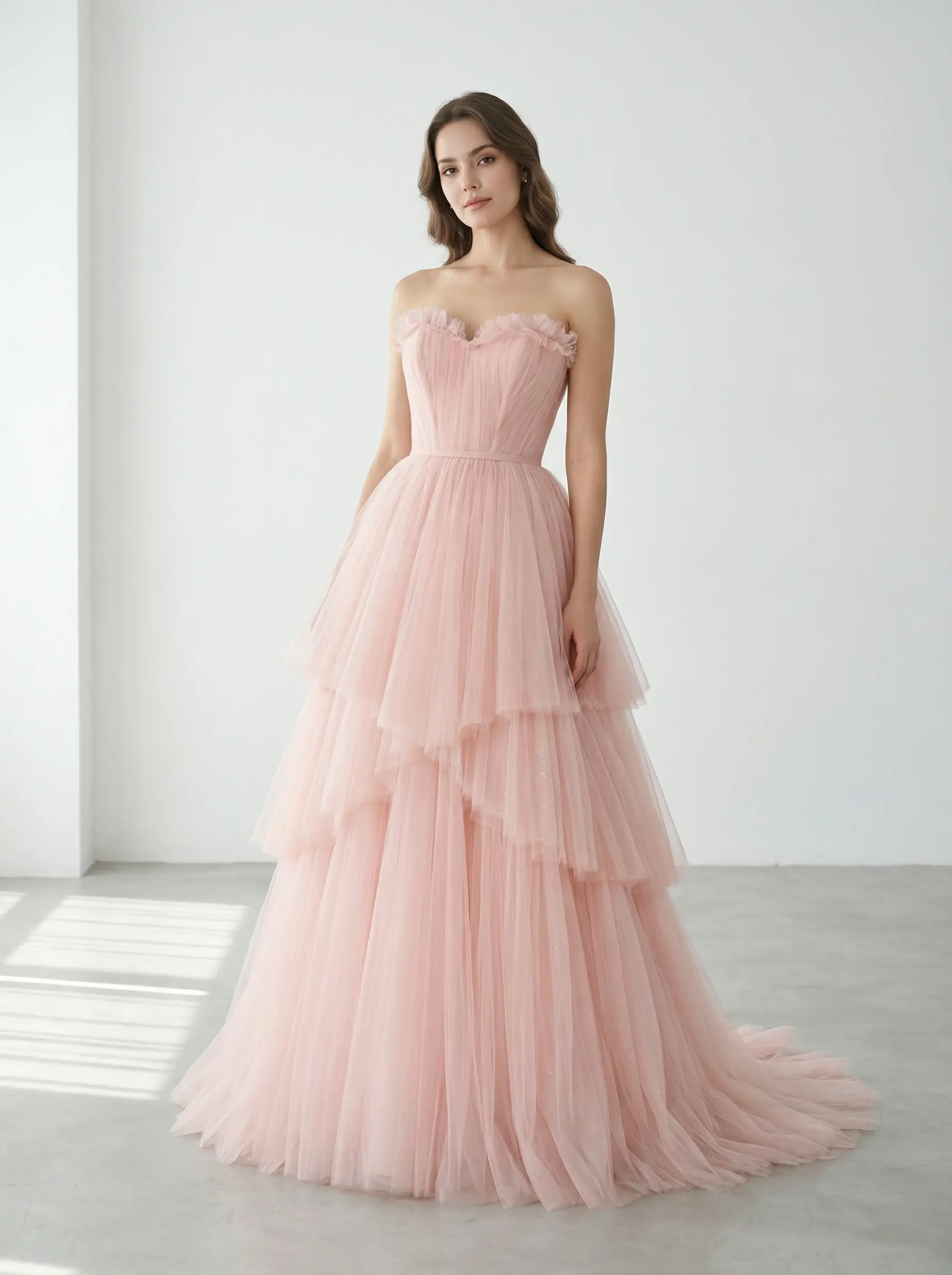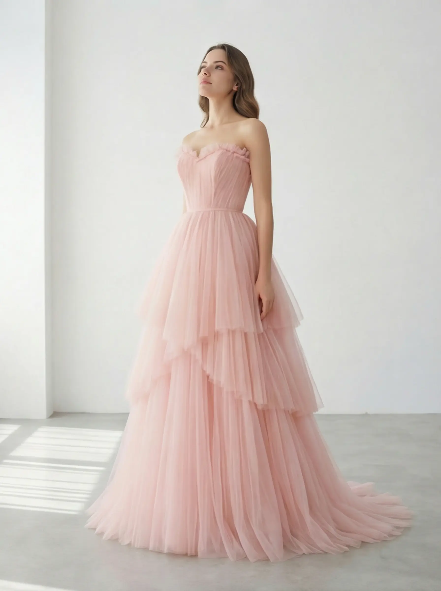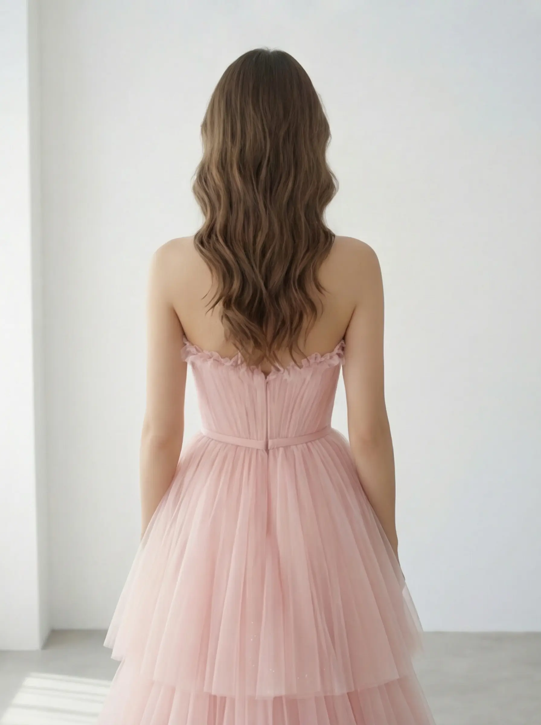 Vestido en tono blush suave elaborado en tul premium de Turquía, con corset strapless corazón delicadamente plisado y falda en capas asimétricas que aportan movimiento etéreo y volumen ligero. Diseño romántico, femenino y elegante, ideal para una presencia soñadora con estructura refinada.