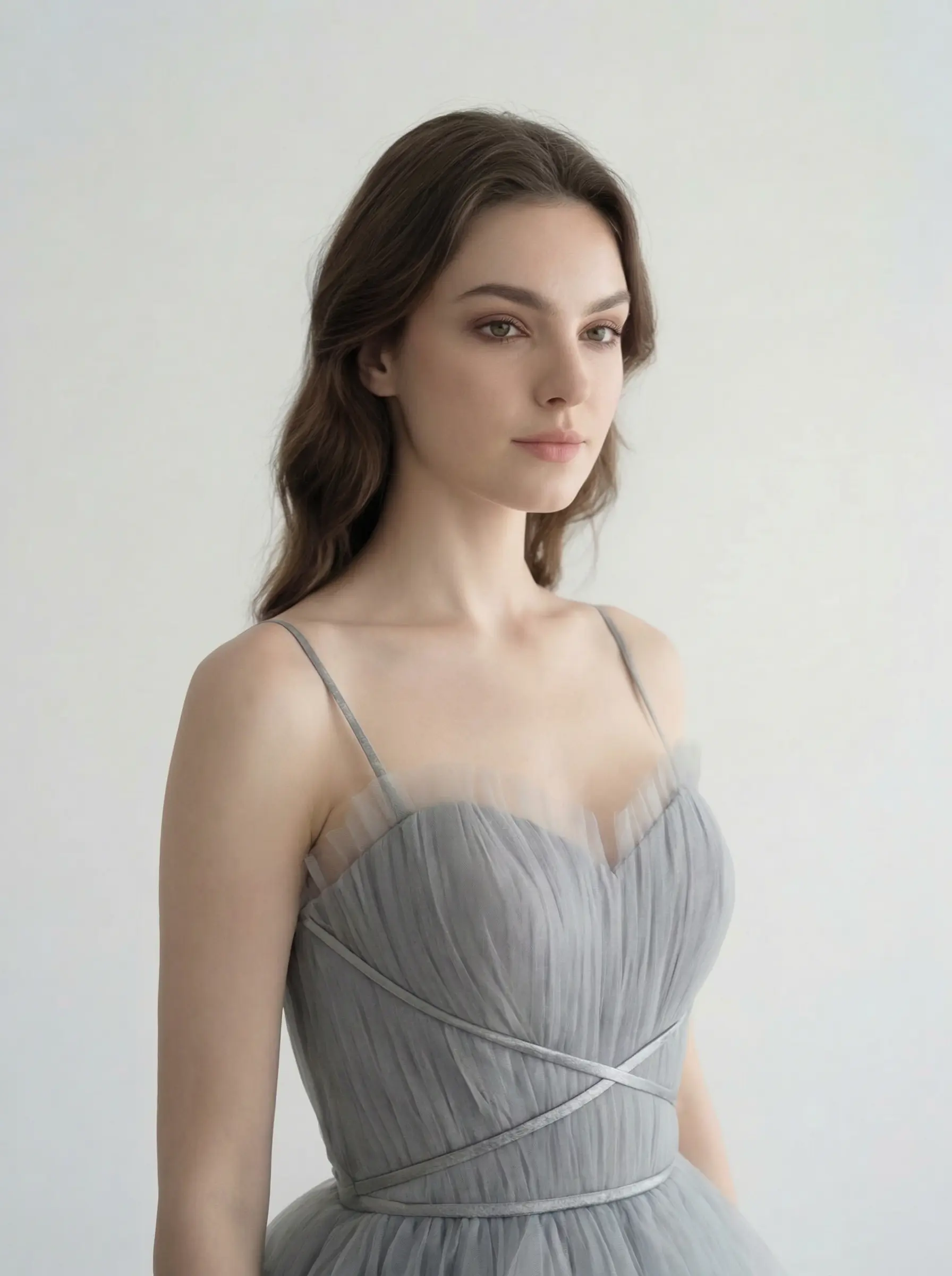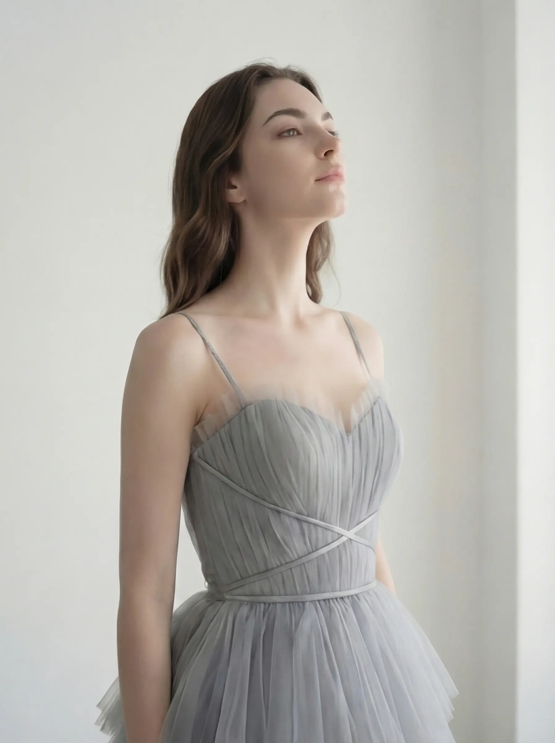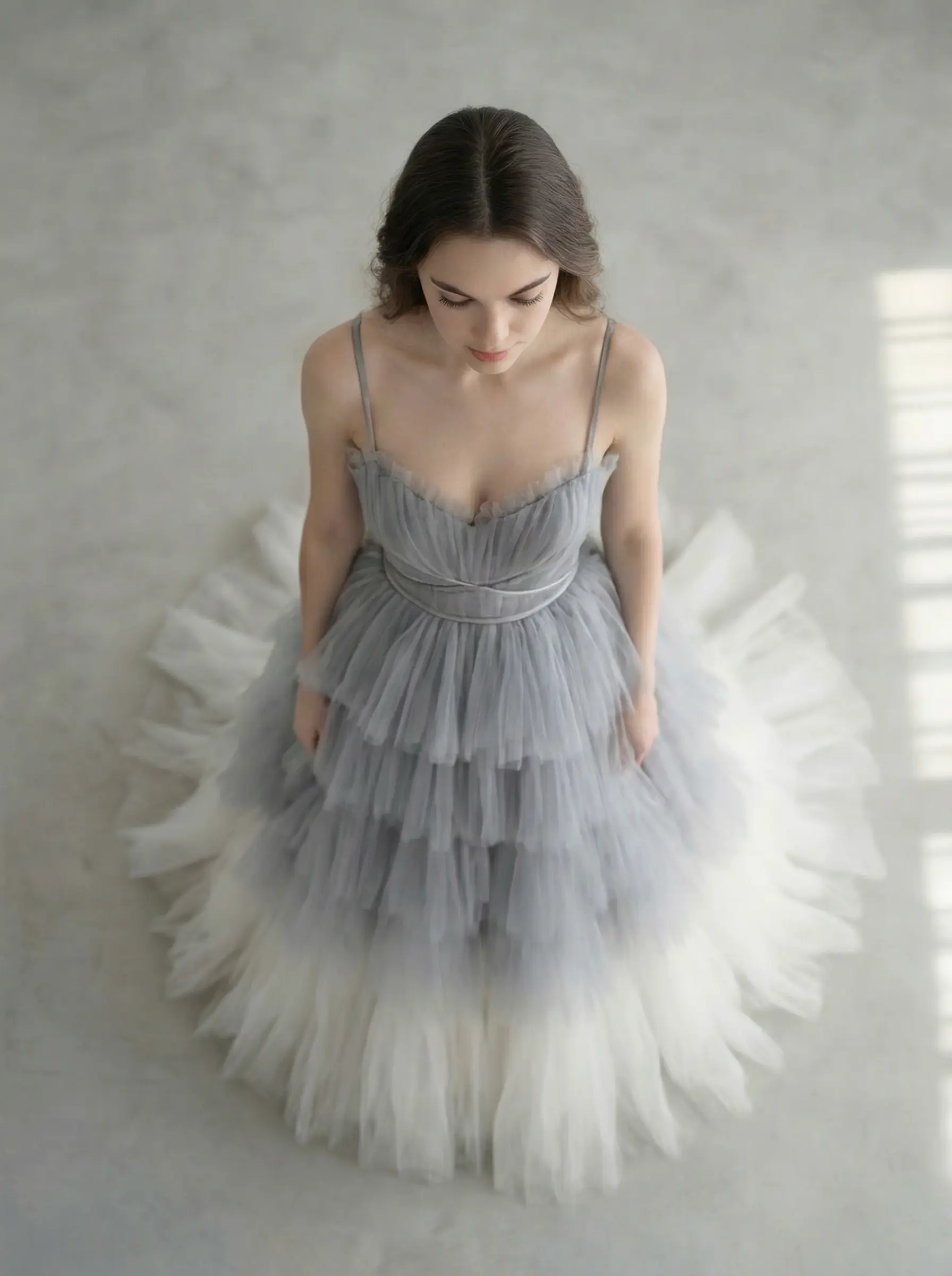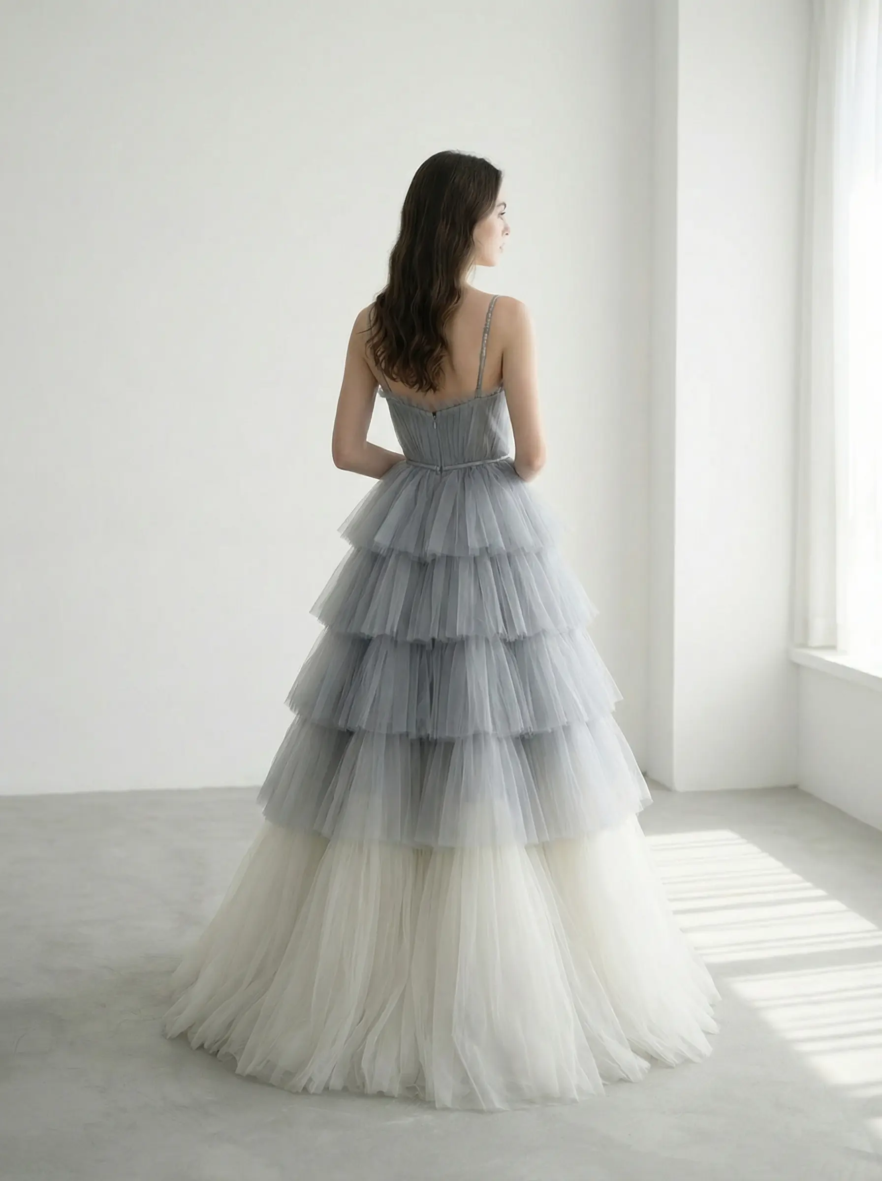 Cuerpo tipo corset con varillas internas para definición de cintura. Falda compuesta por múltiples capas horizontales fruncidas en degradado progresivo para volumen estructurado. Cierre posterior invisible.