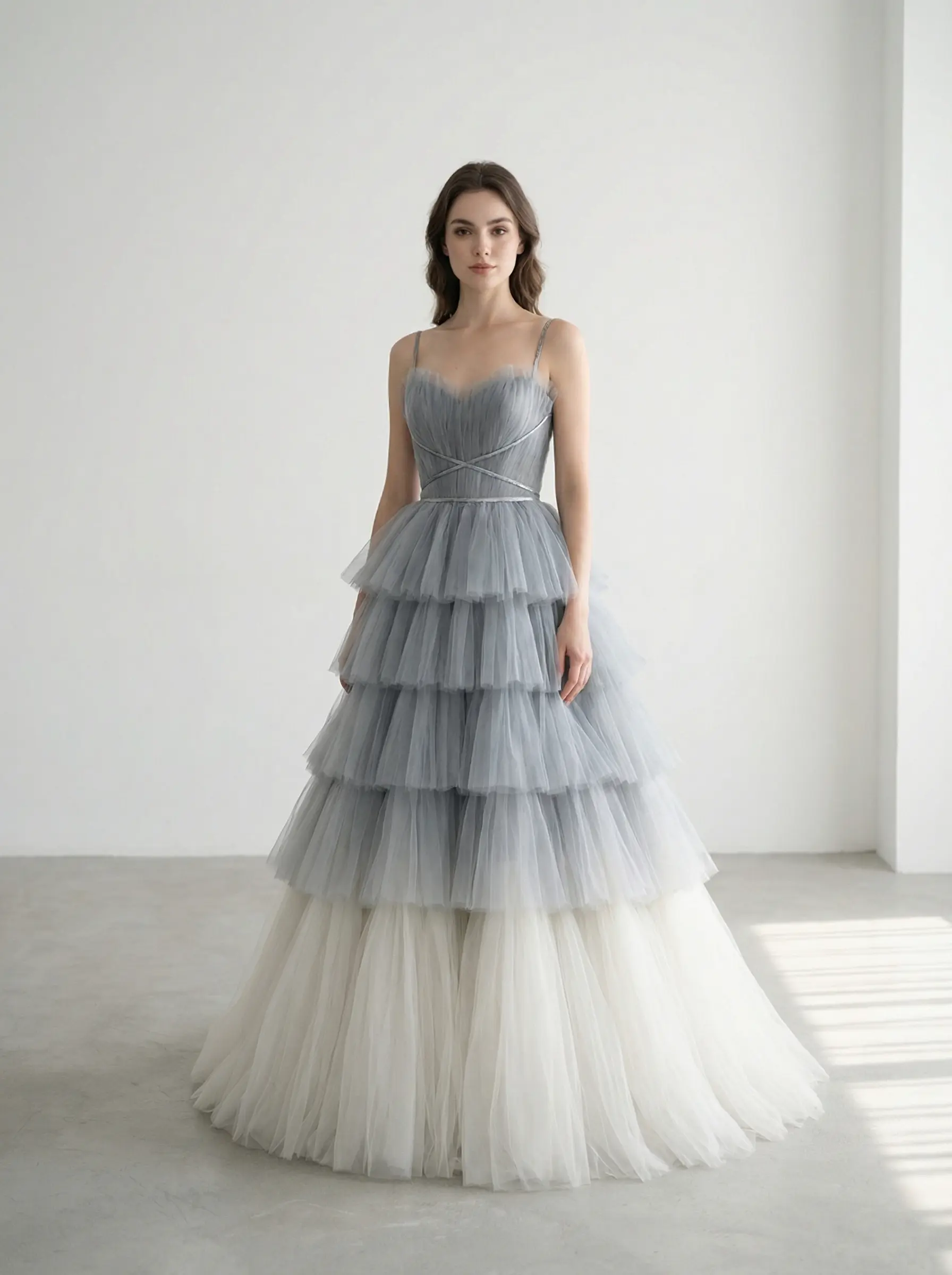 Corte princesa estilizado con falda amplia en capas escalonadas y cola integrada.