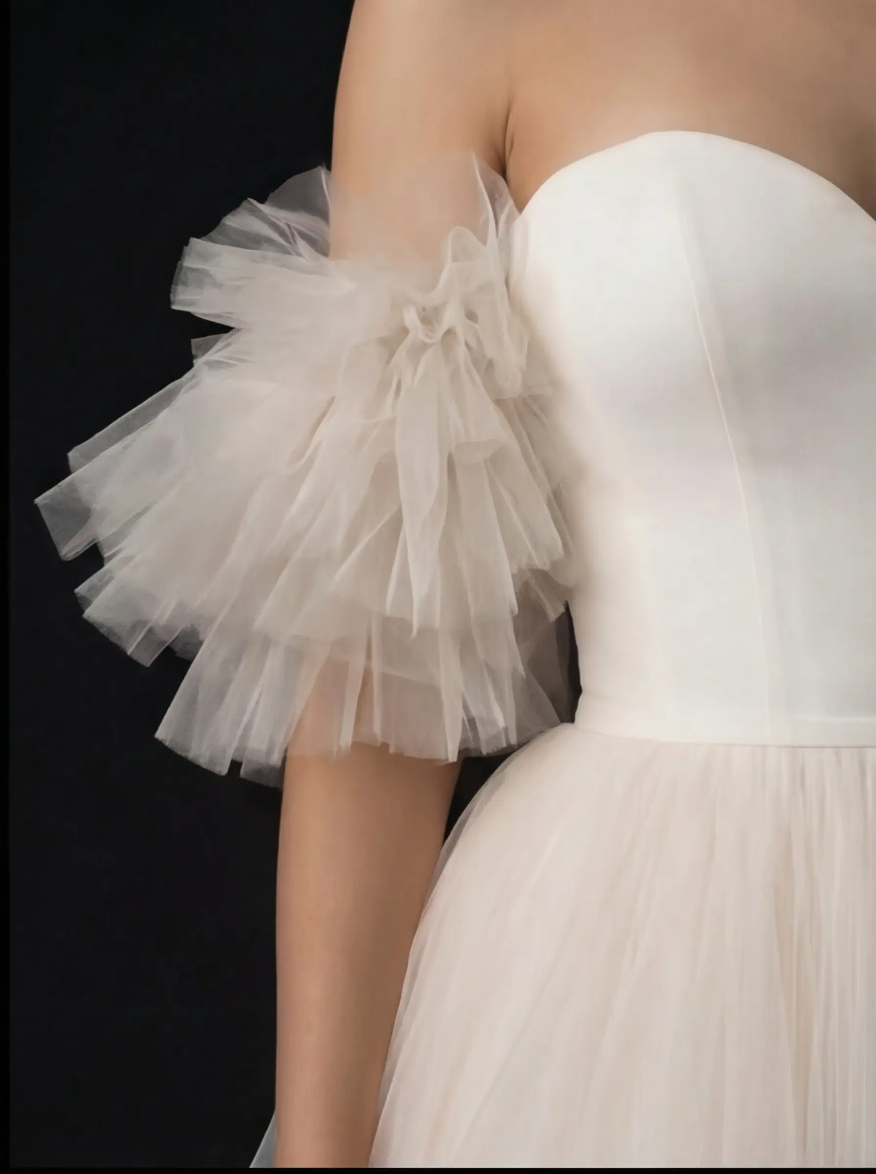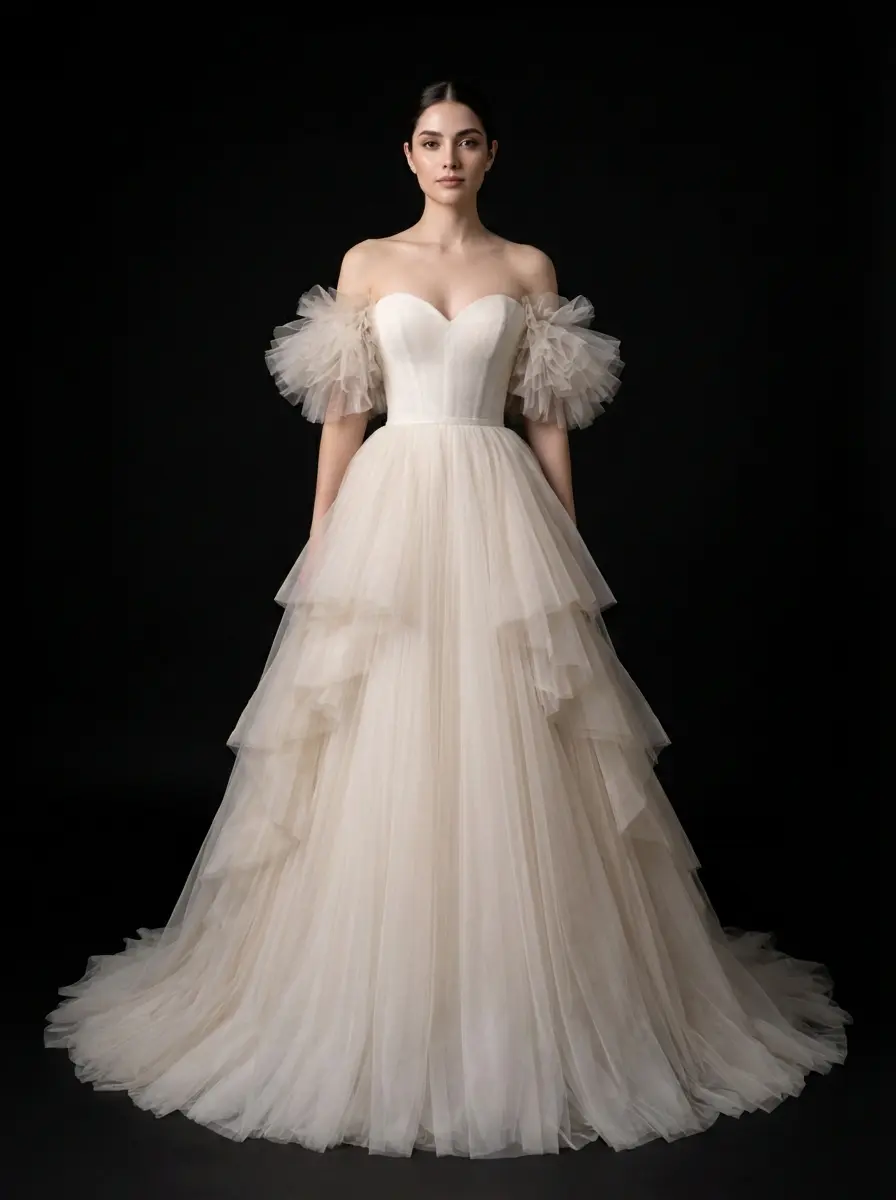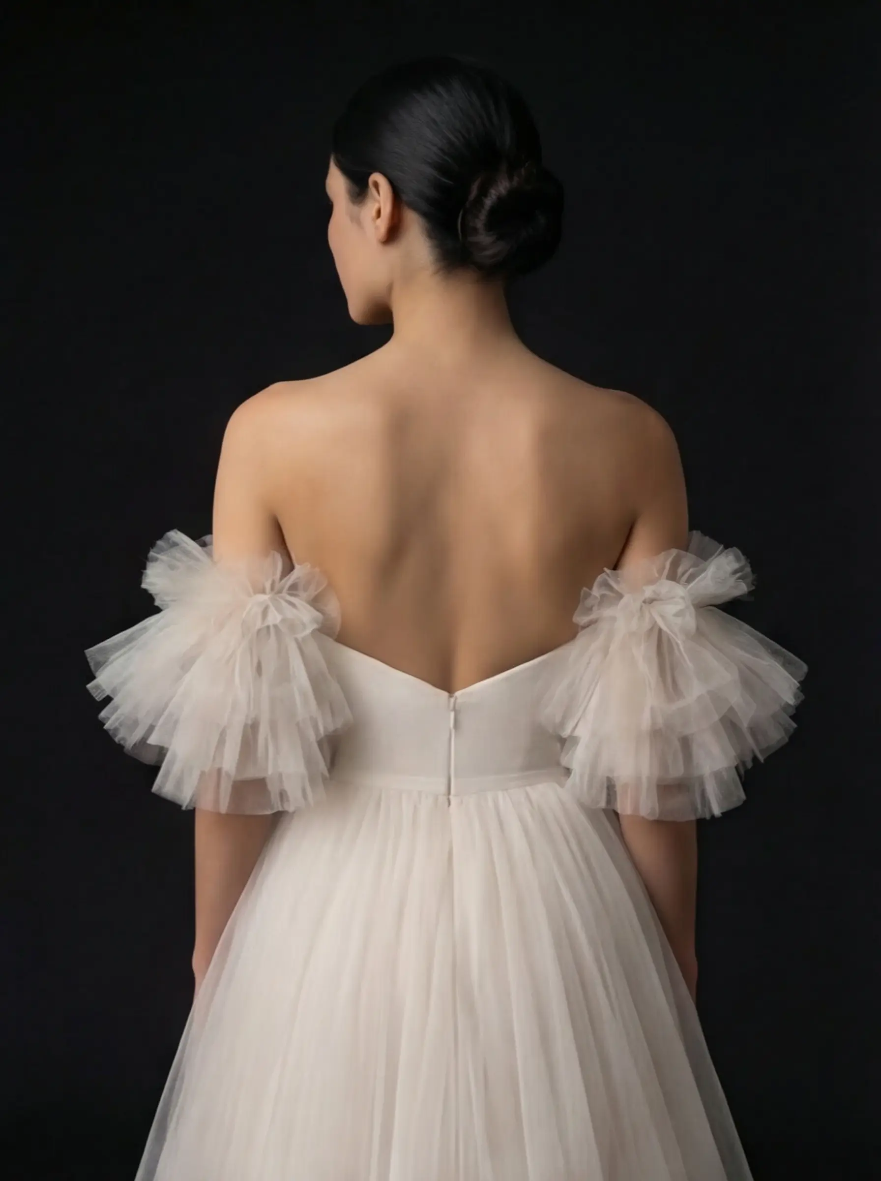 Tul premium marfil multicapa con mangas fruncidas de alto volumen.