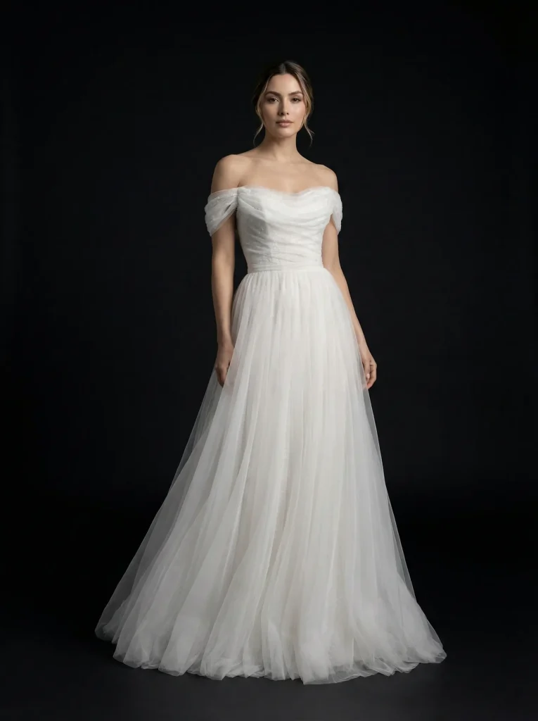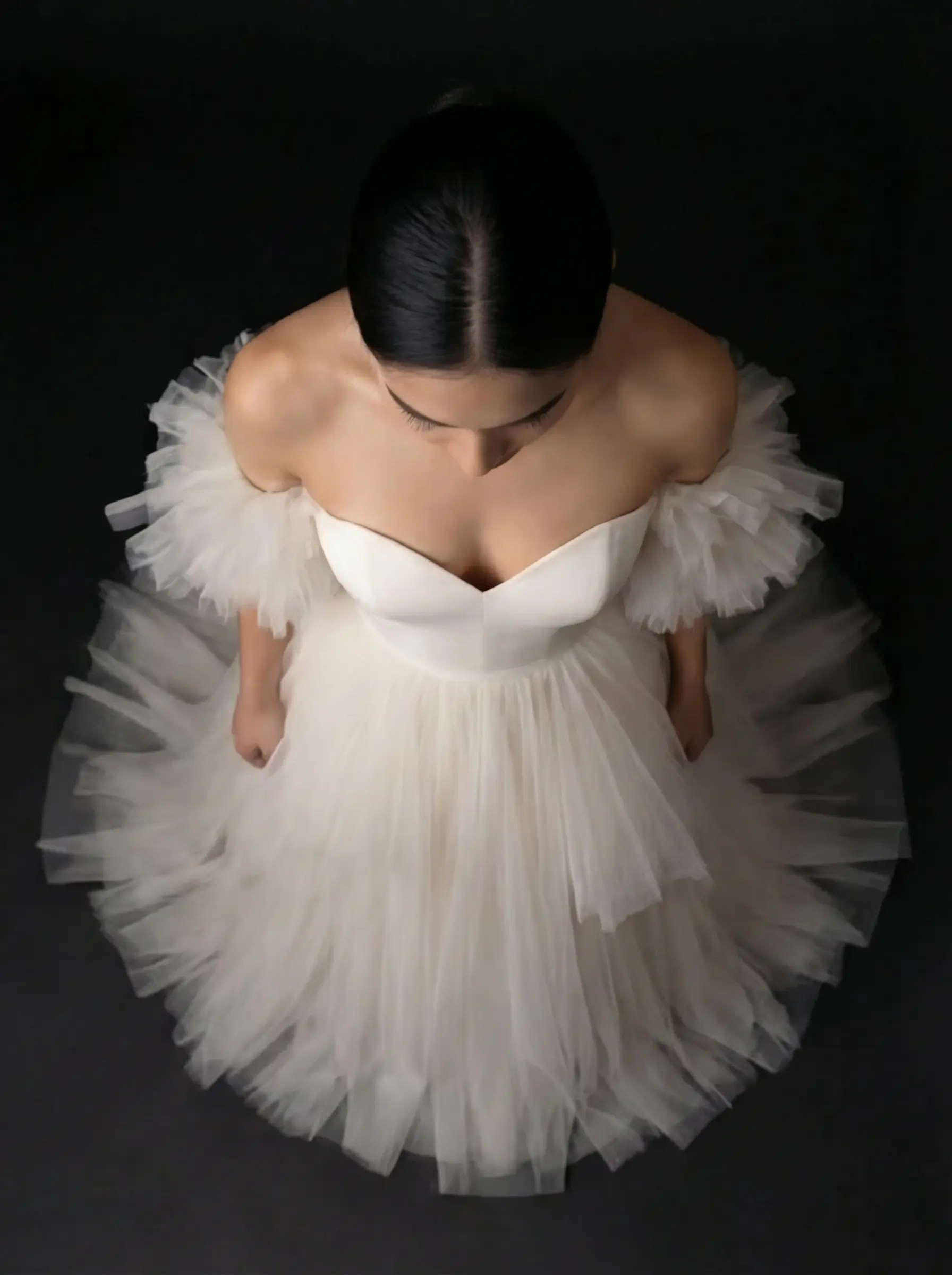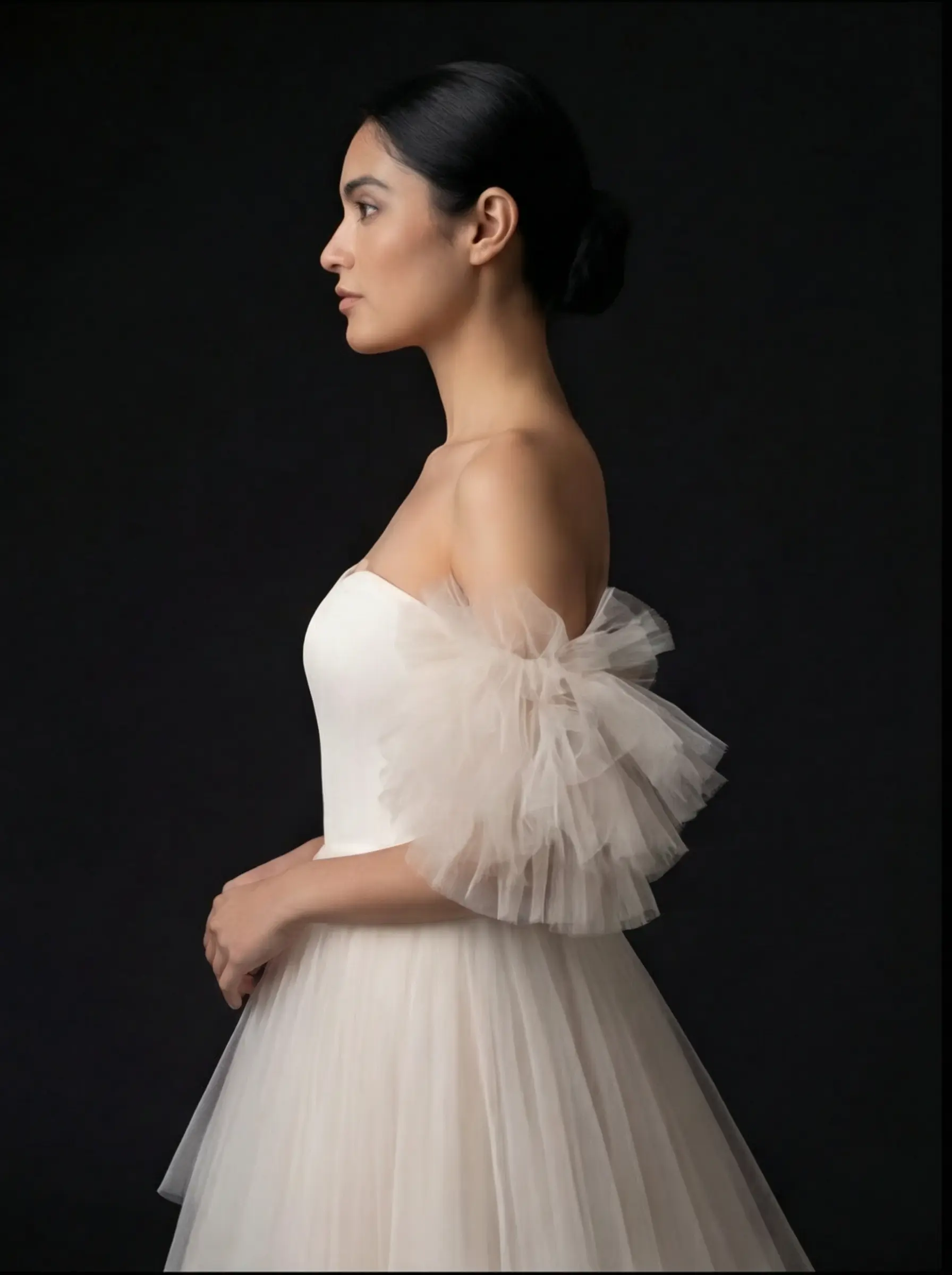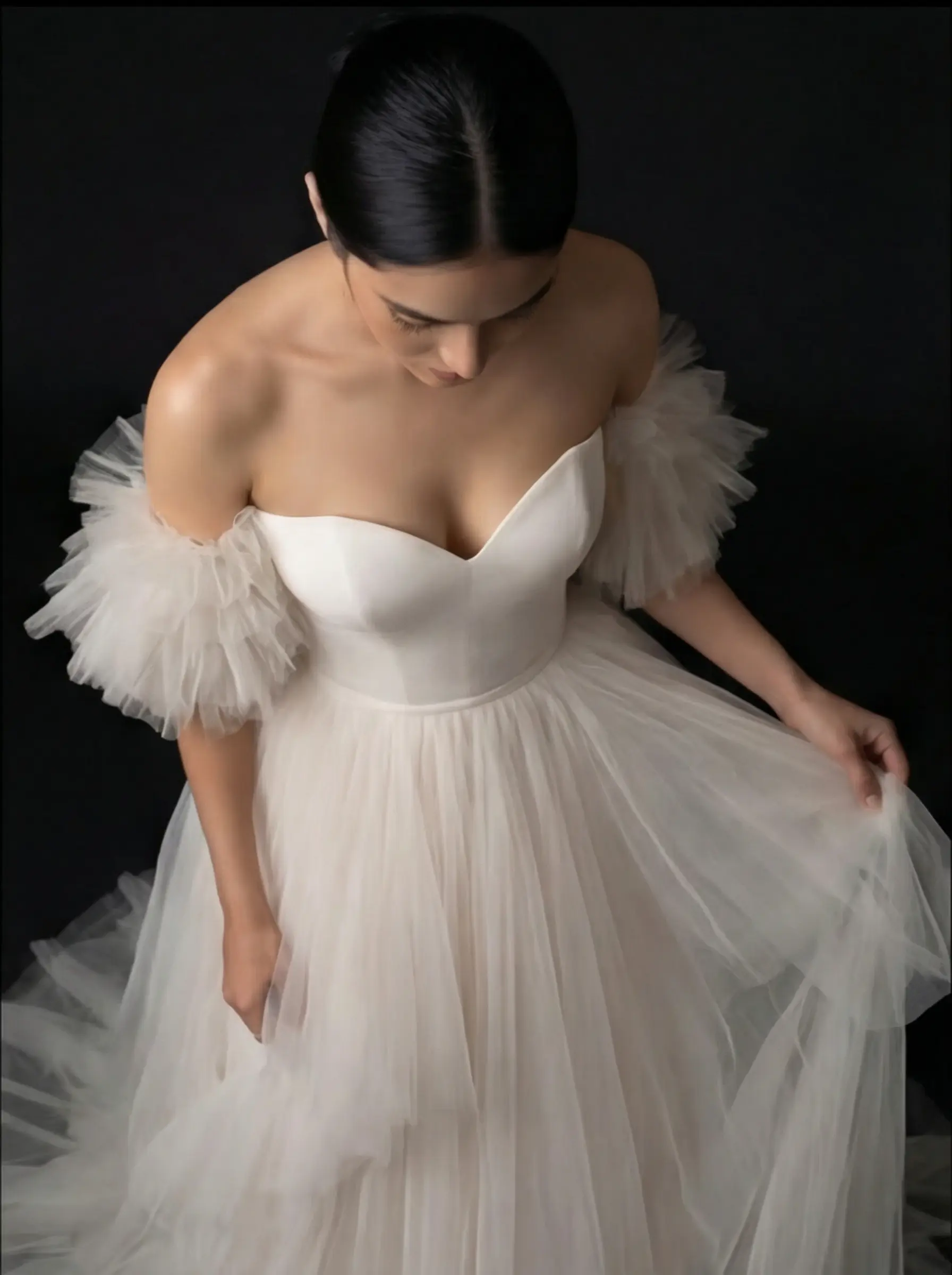 Tul premium marfil multicapa con mangas fruncidas de alto volumen.