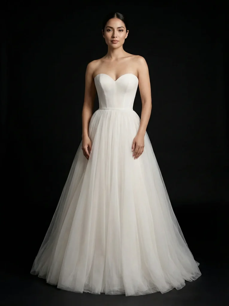 Corazón definido con soporte interno y mangas volumétricas en tul.