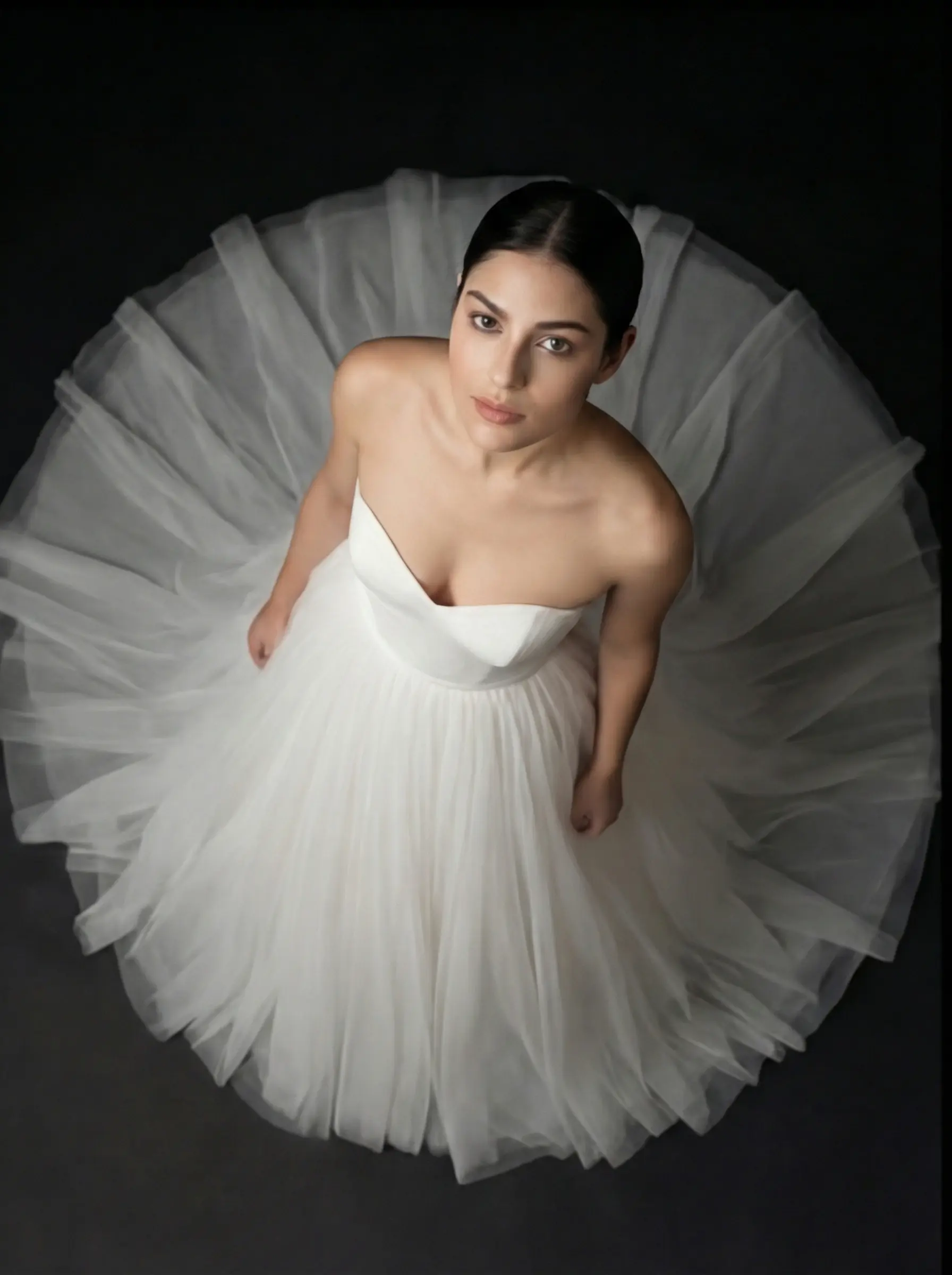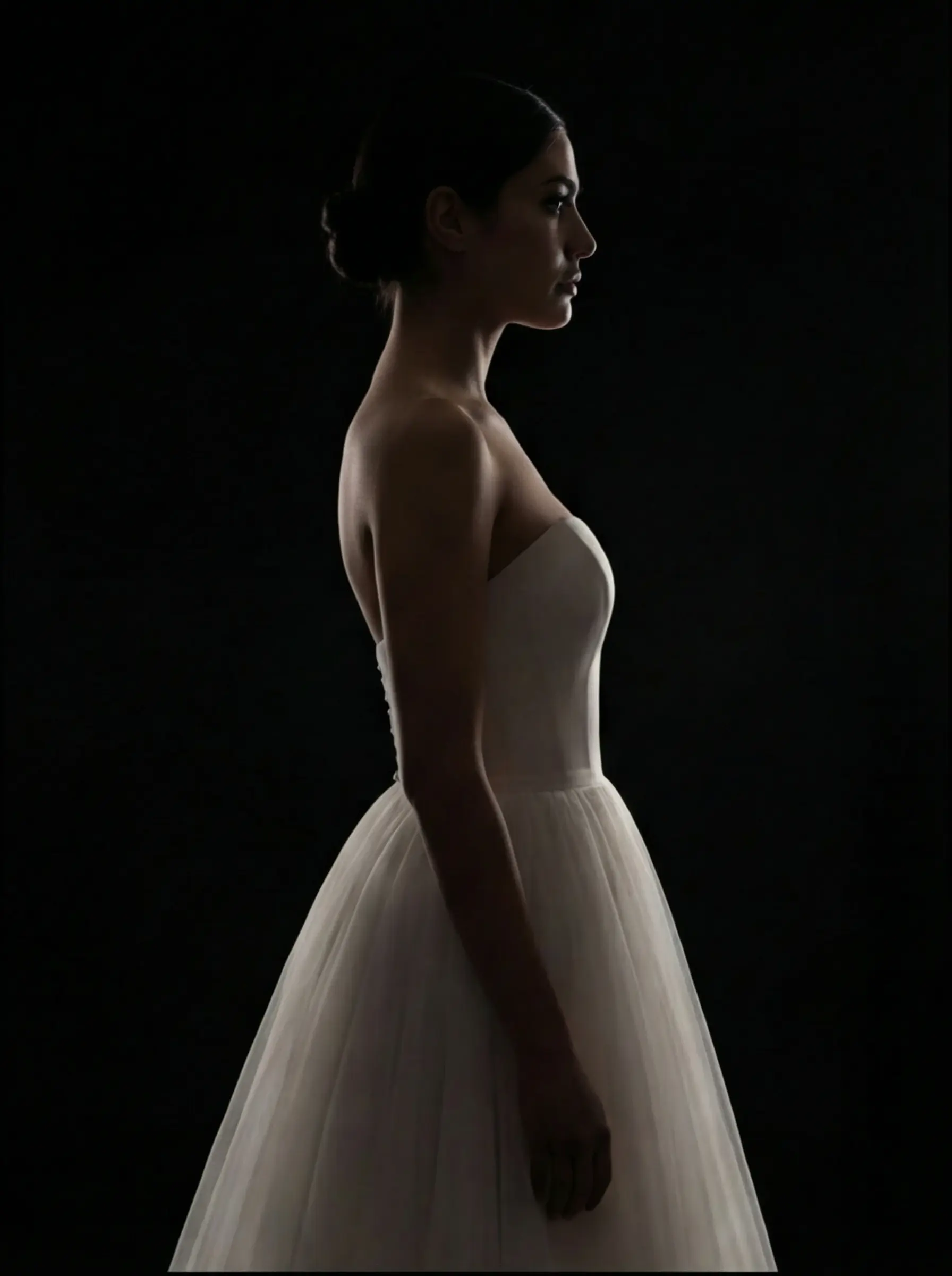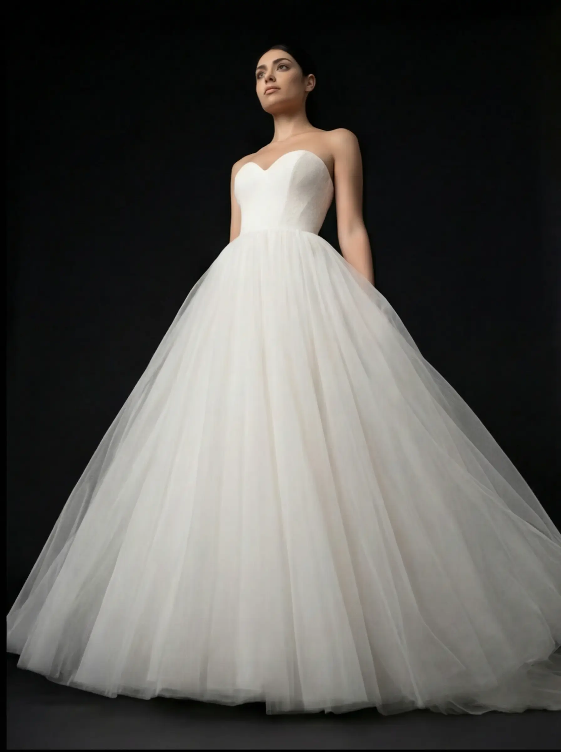 Confección bajo pedido con corsetería interna estructurada, moldeado preciso en busto y ensamblado manual de capas para lograr caída armónica y volumen equilibrado.