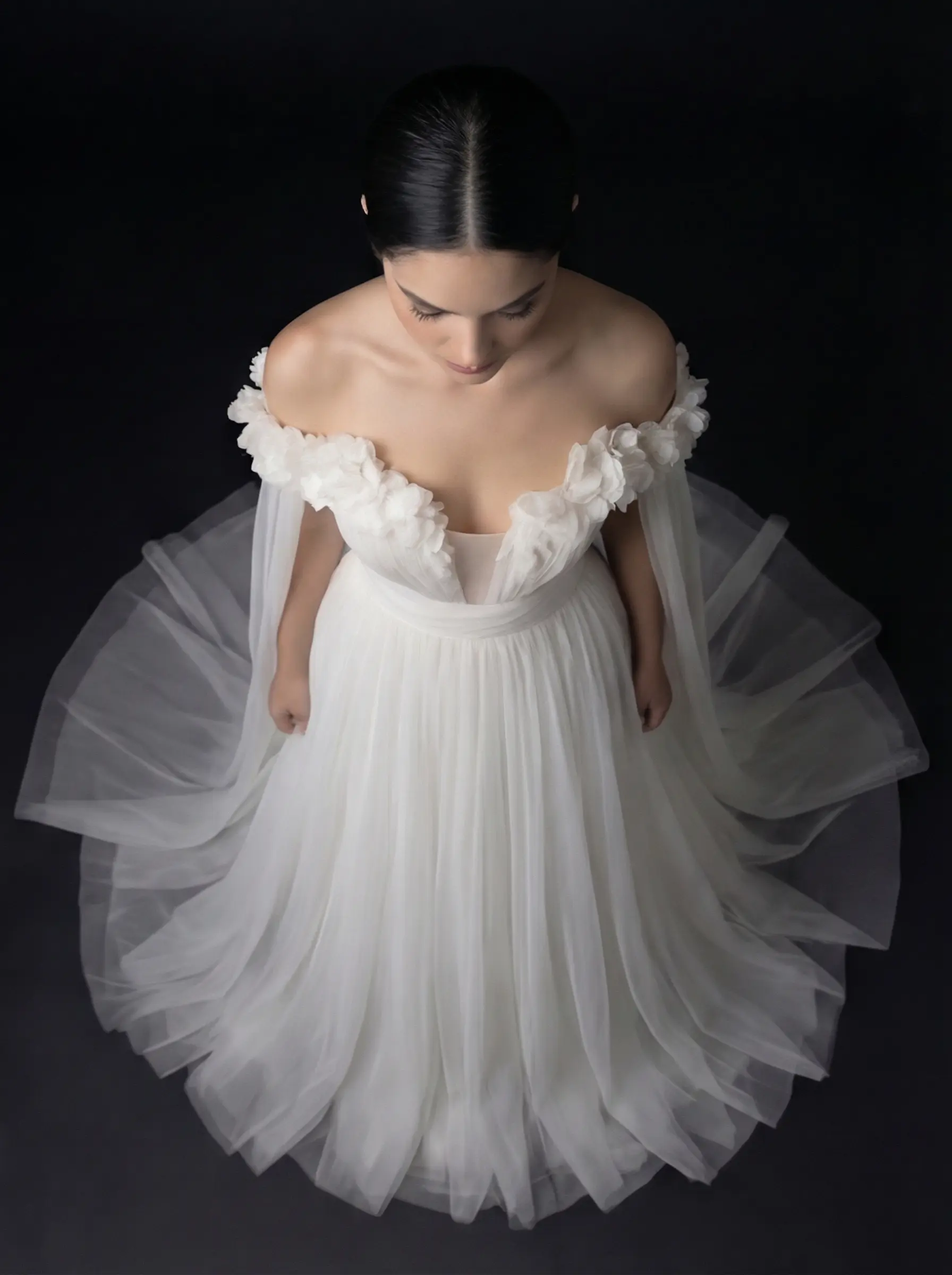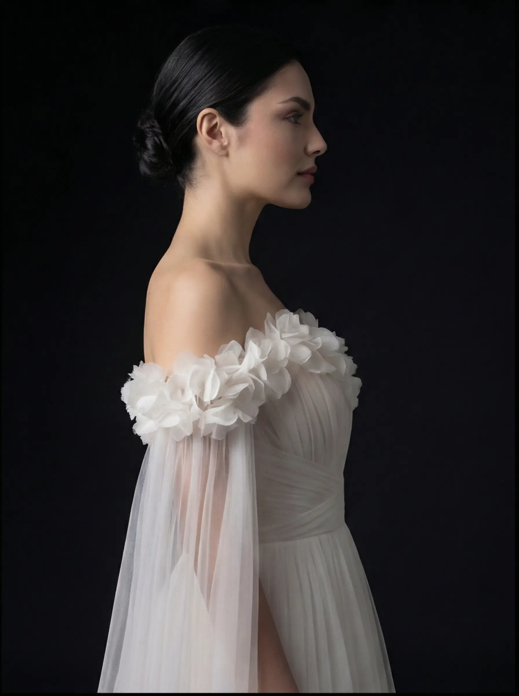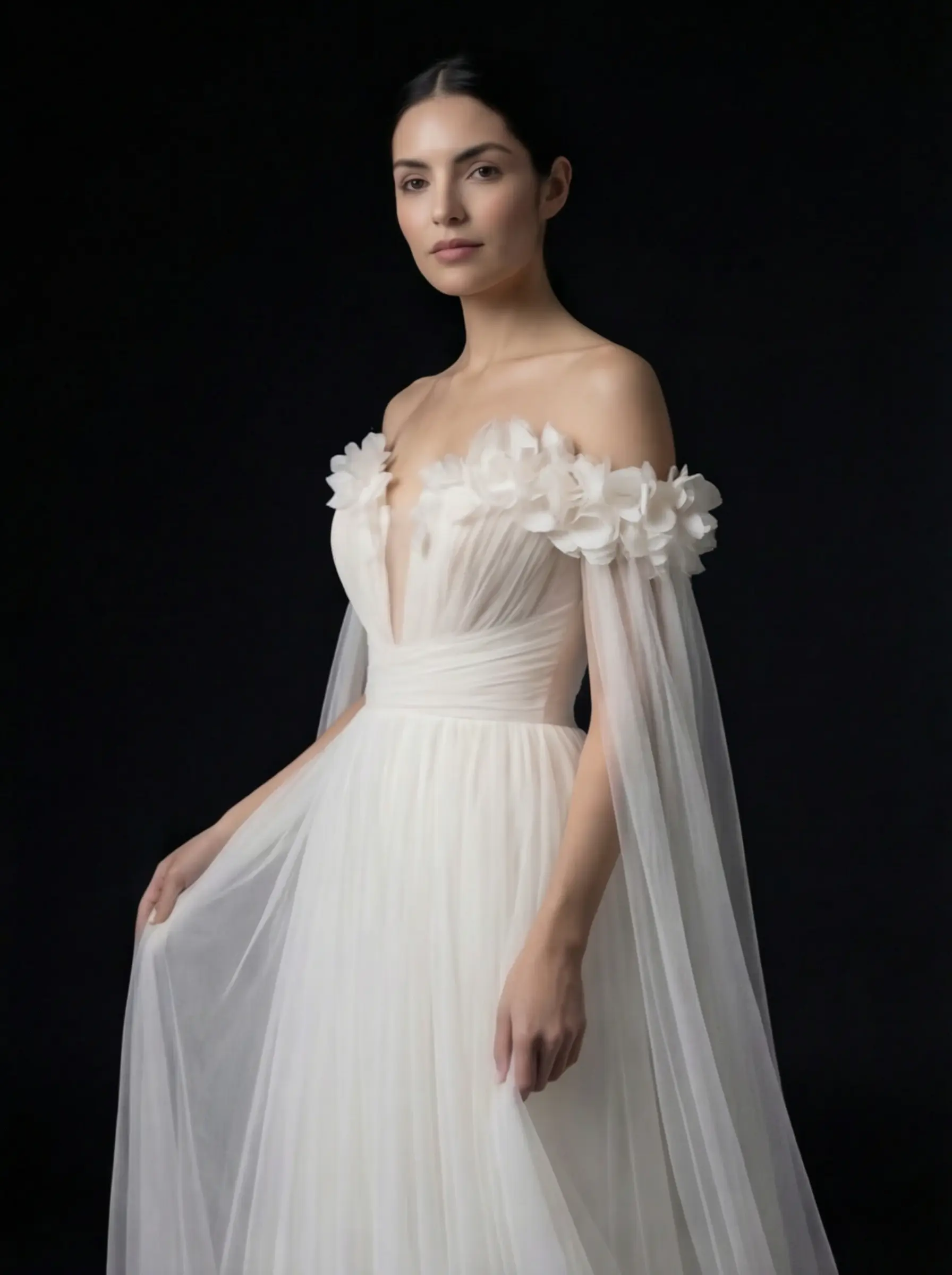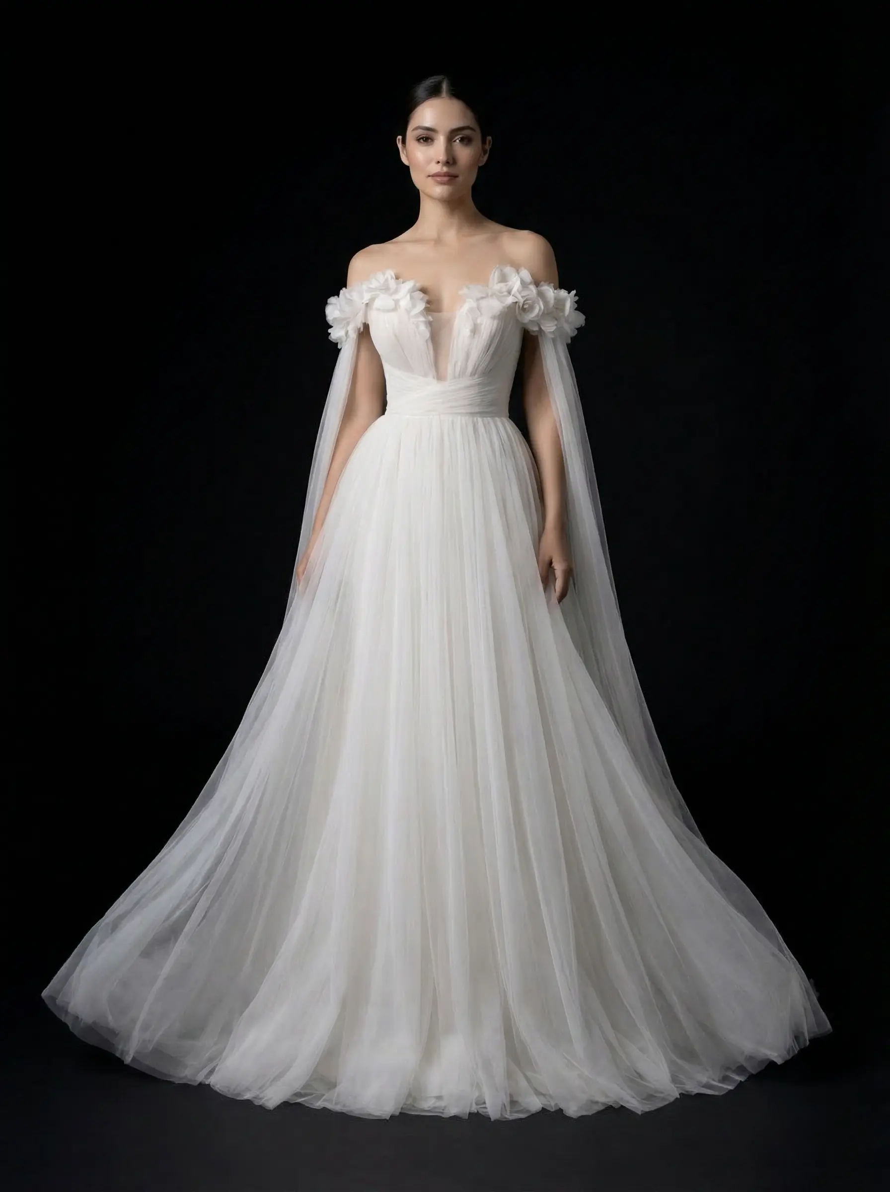 Tul premium marfil con aplicaciones florales artesanales en volumen ligero.