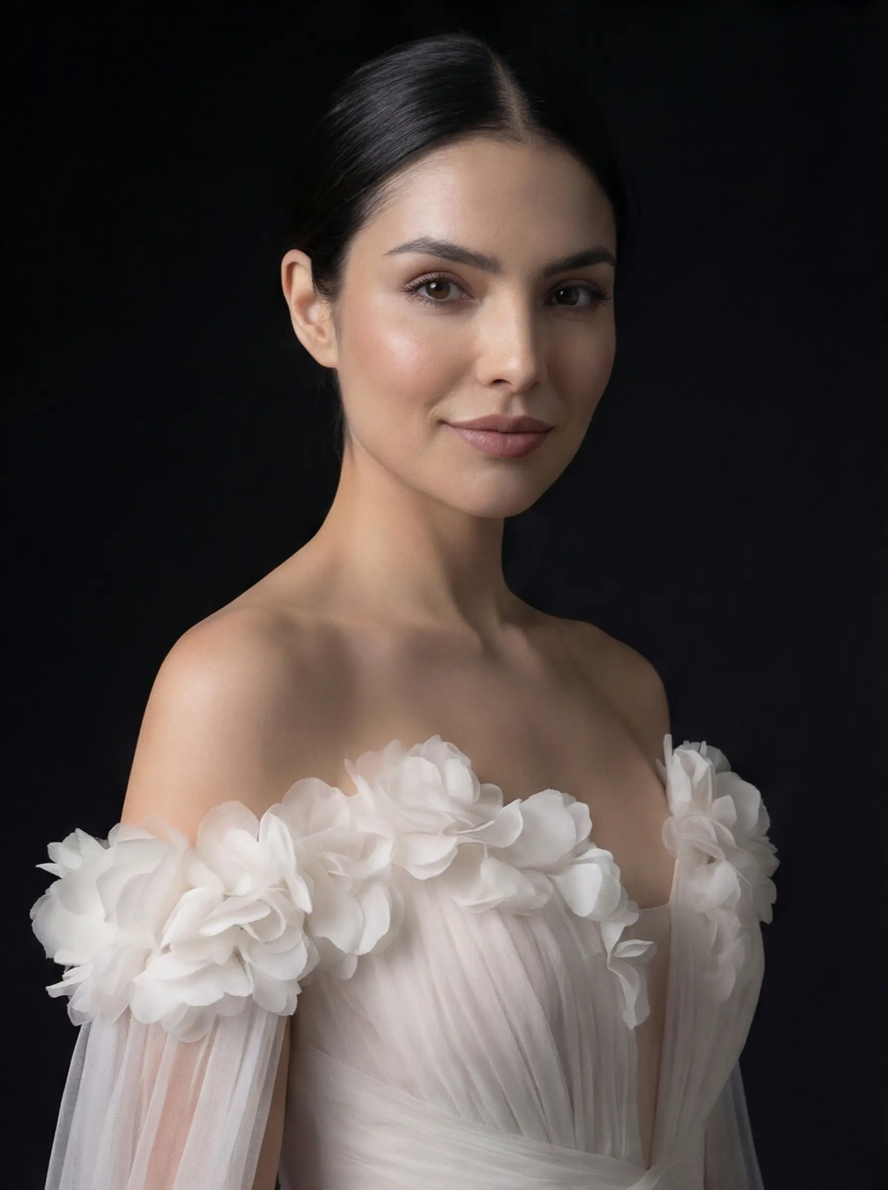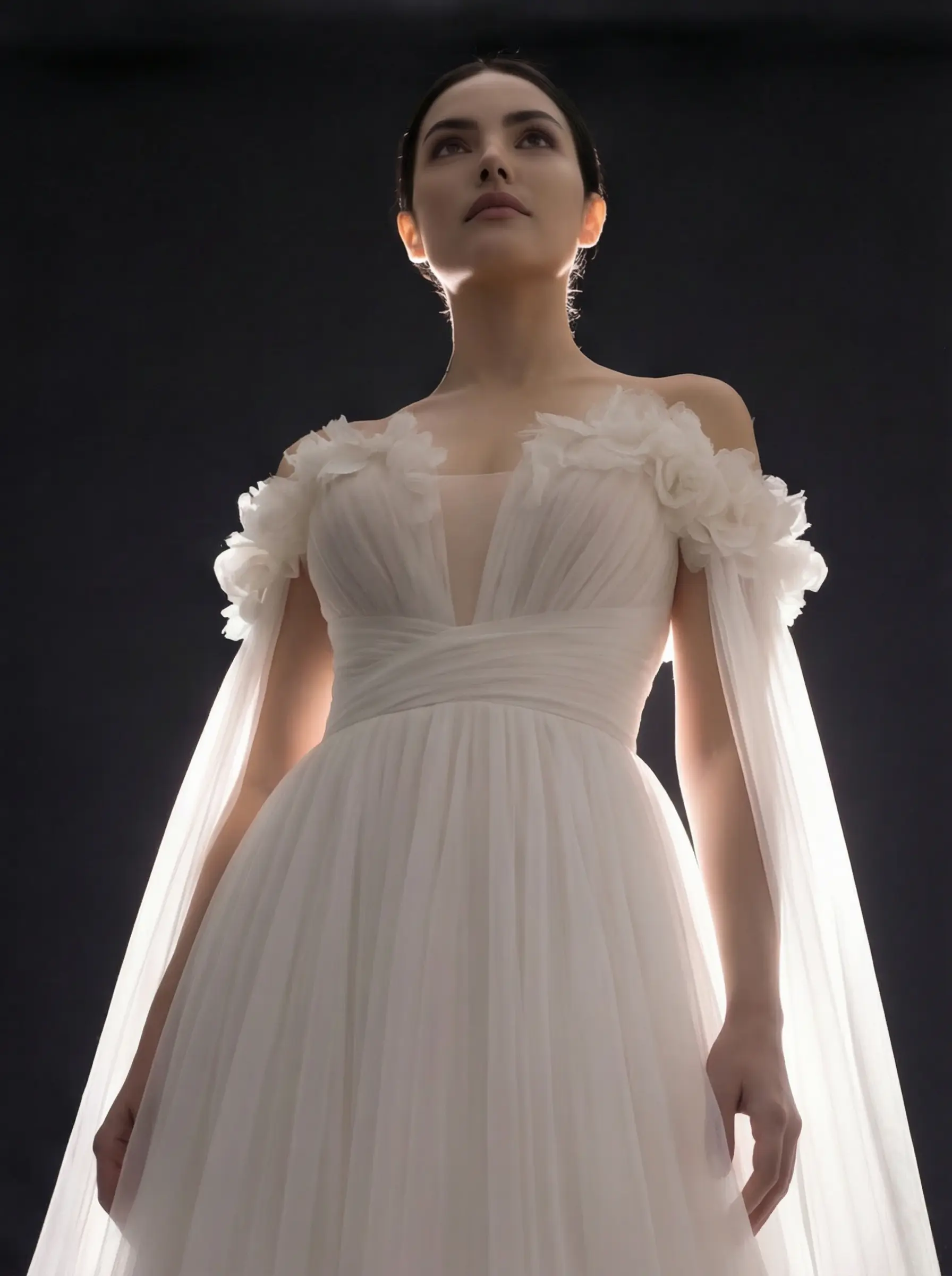 Corsetería interna estructurada, drapeado manual en cintura, aplicación artesanal de flores 3D y montaje de capas en tul con caída continua hacia cola integrada.