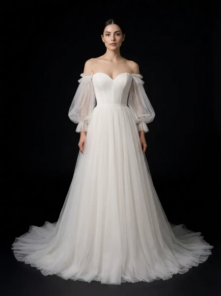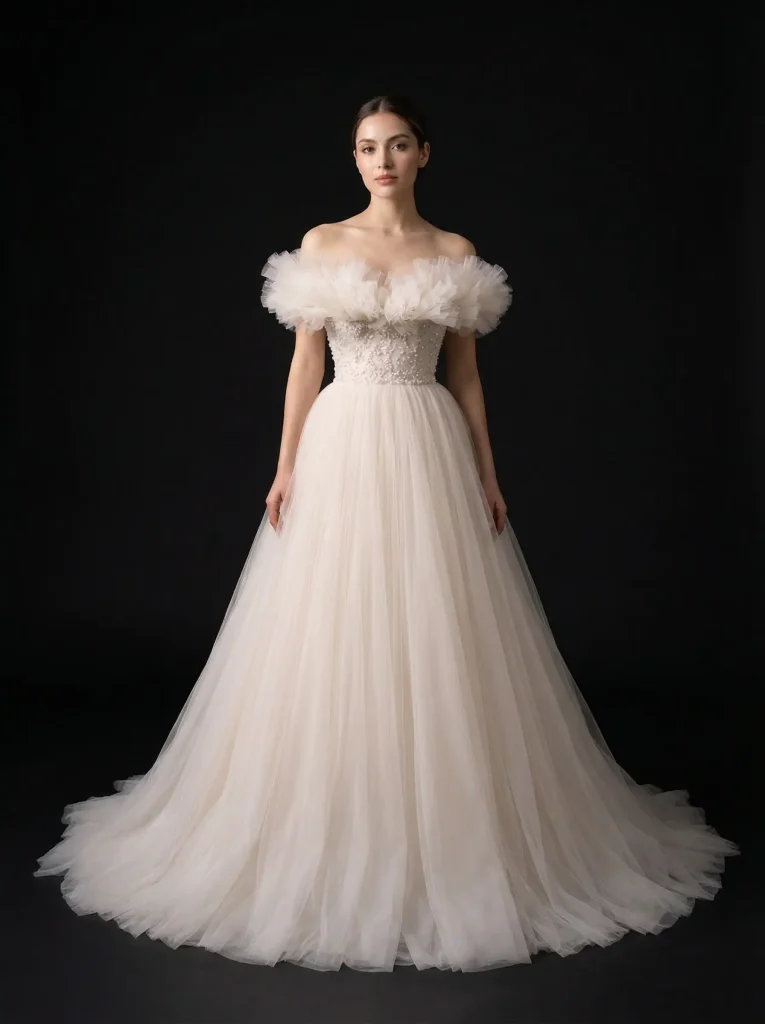Tul premium marfil multicapa con mangas florales en volumen suave.