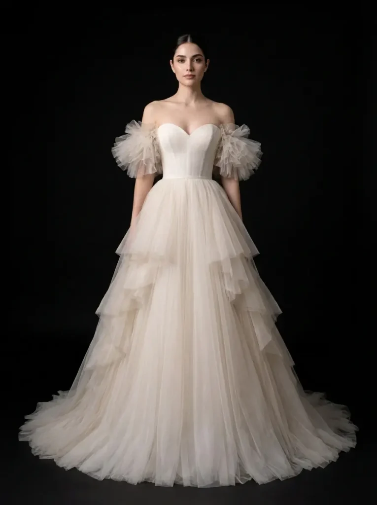 Corte A estructurado con falda amplia multicapa y cola ligera integrada.