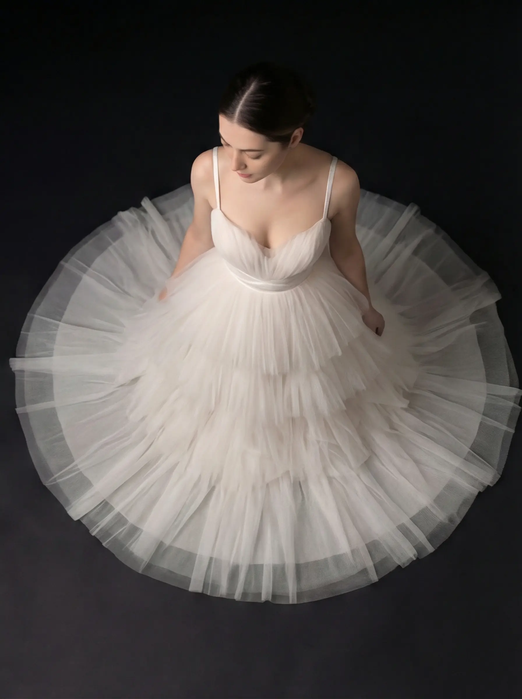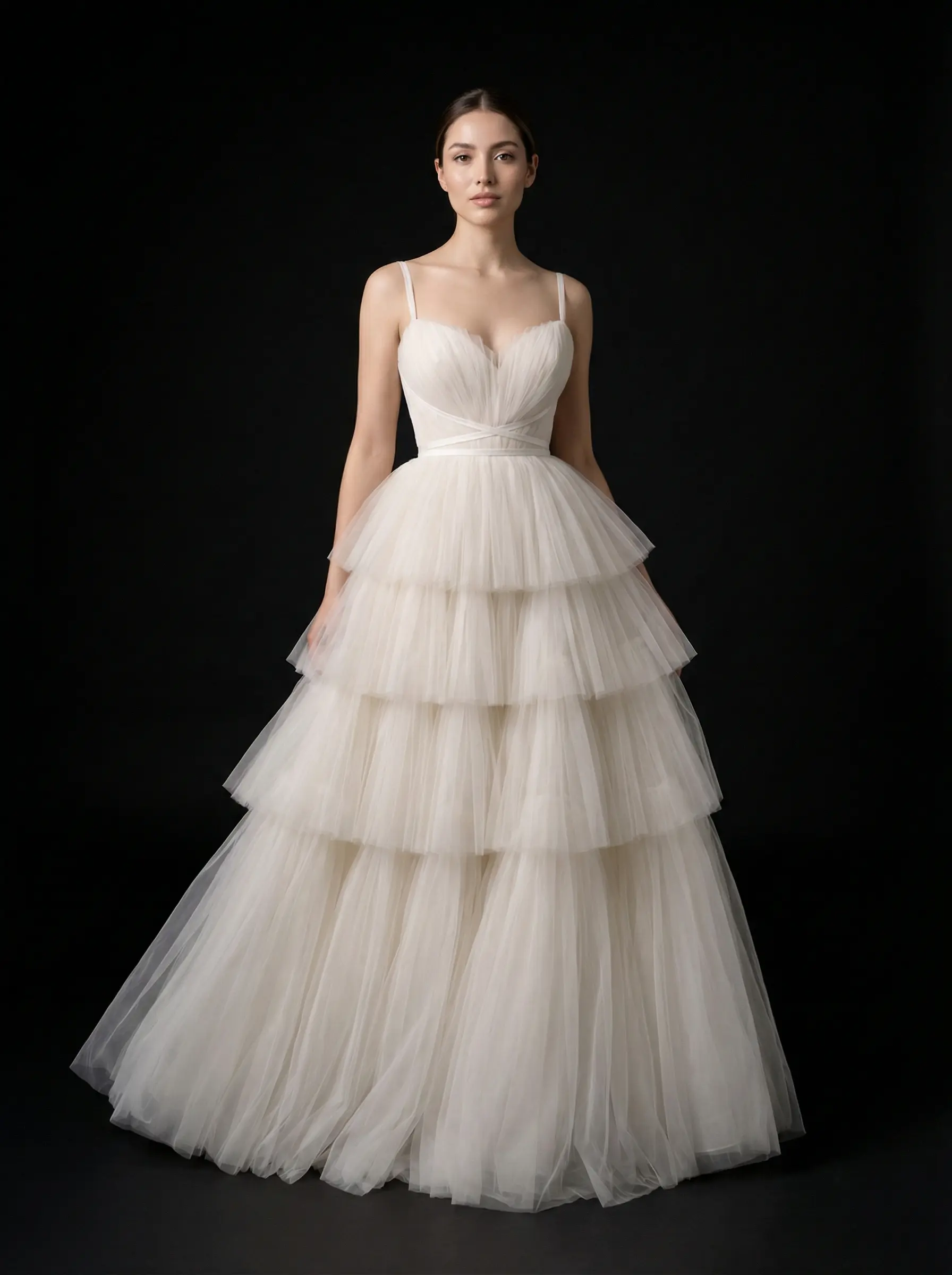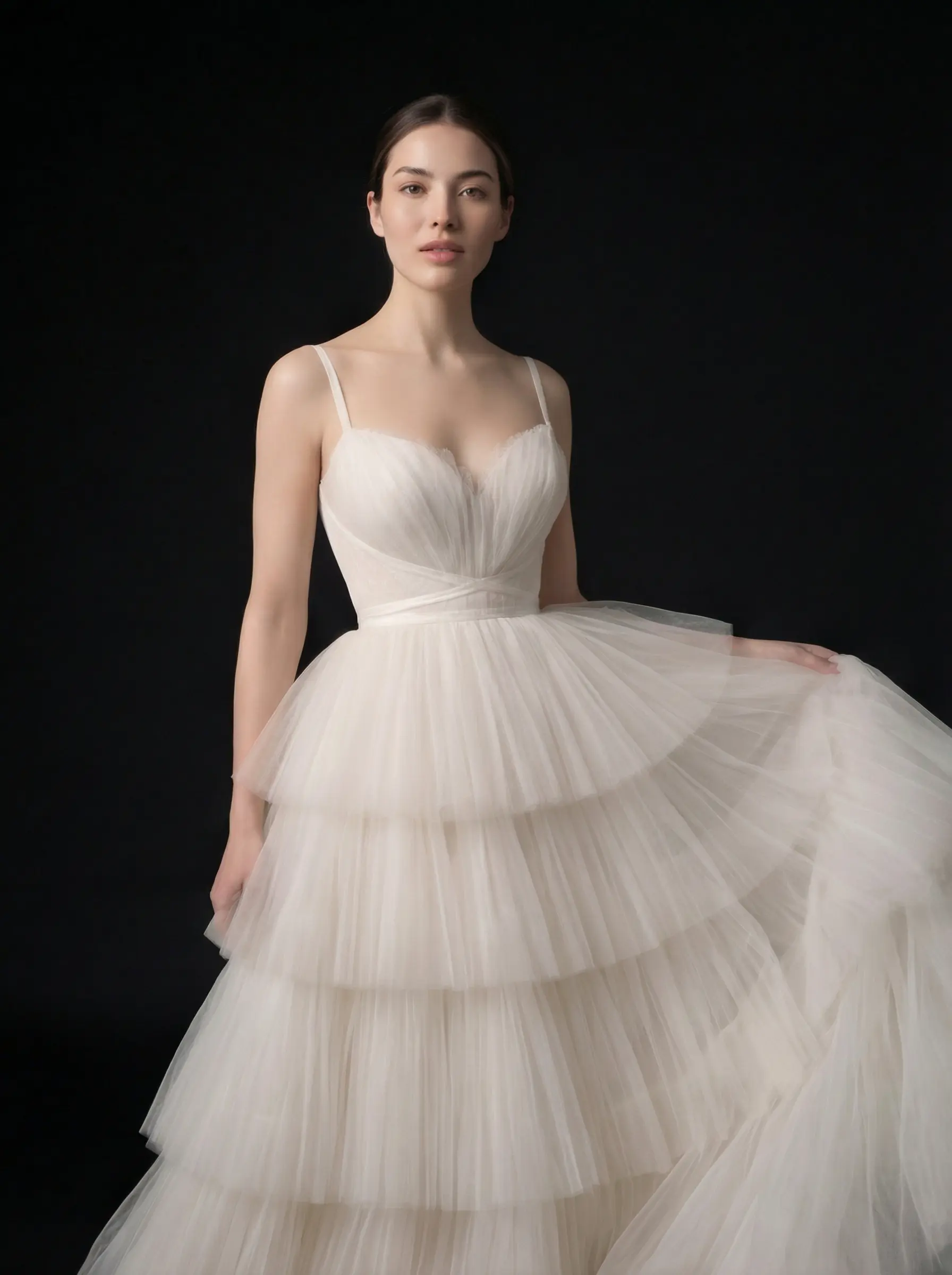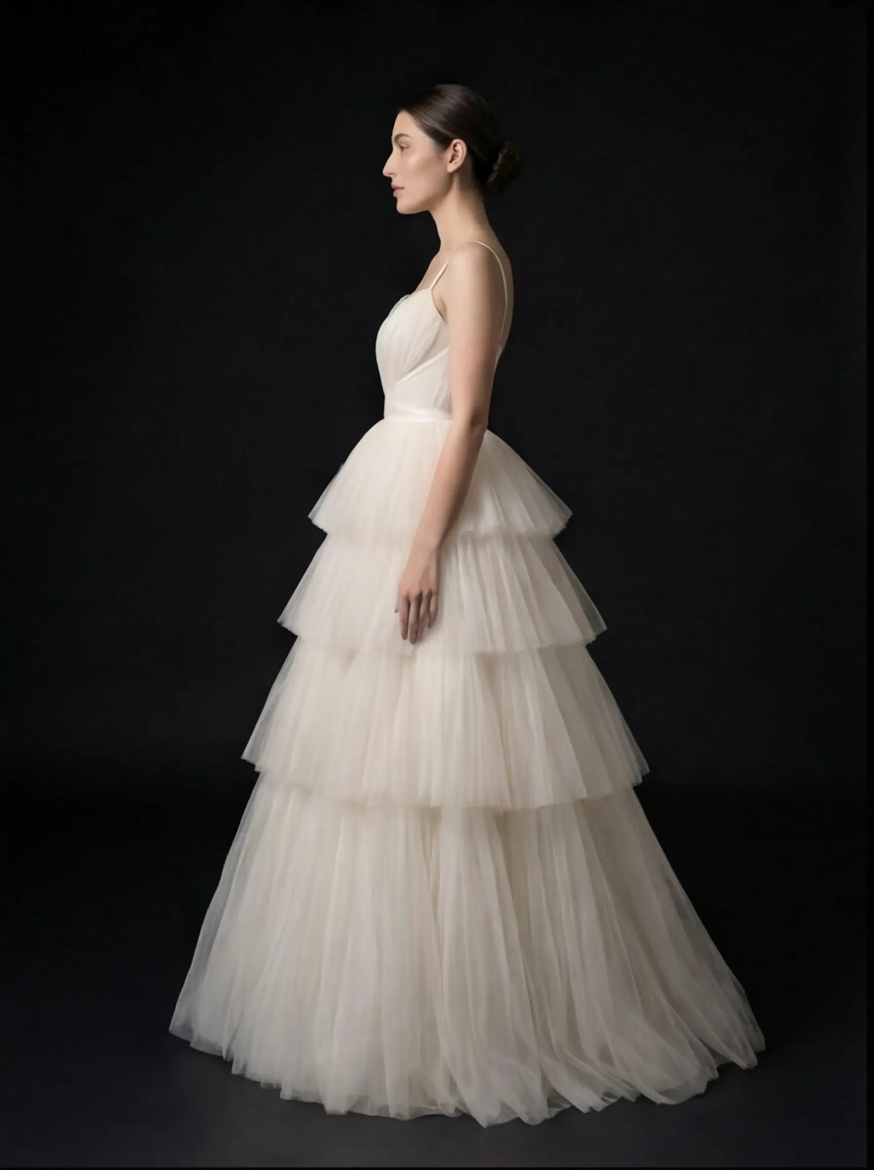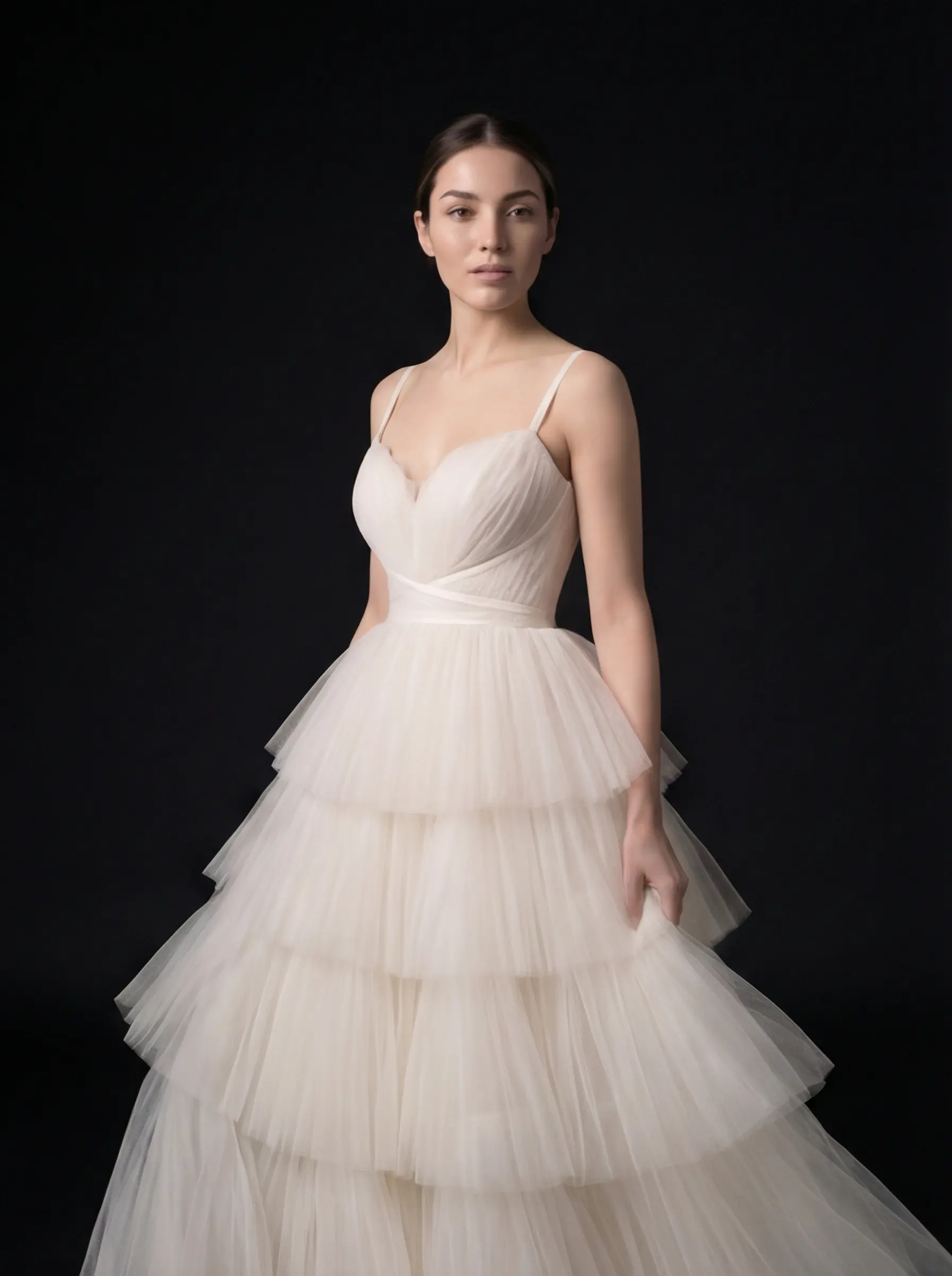 Corsetería interna con soporte discreto, armado manual de capas en niveles, cruce estructural en cintura y montaje artesanal de falda con caída progresiva.