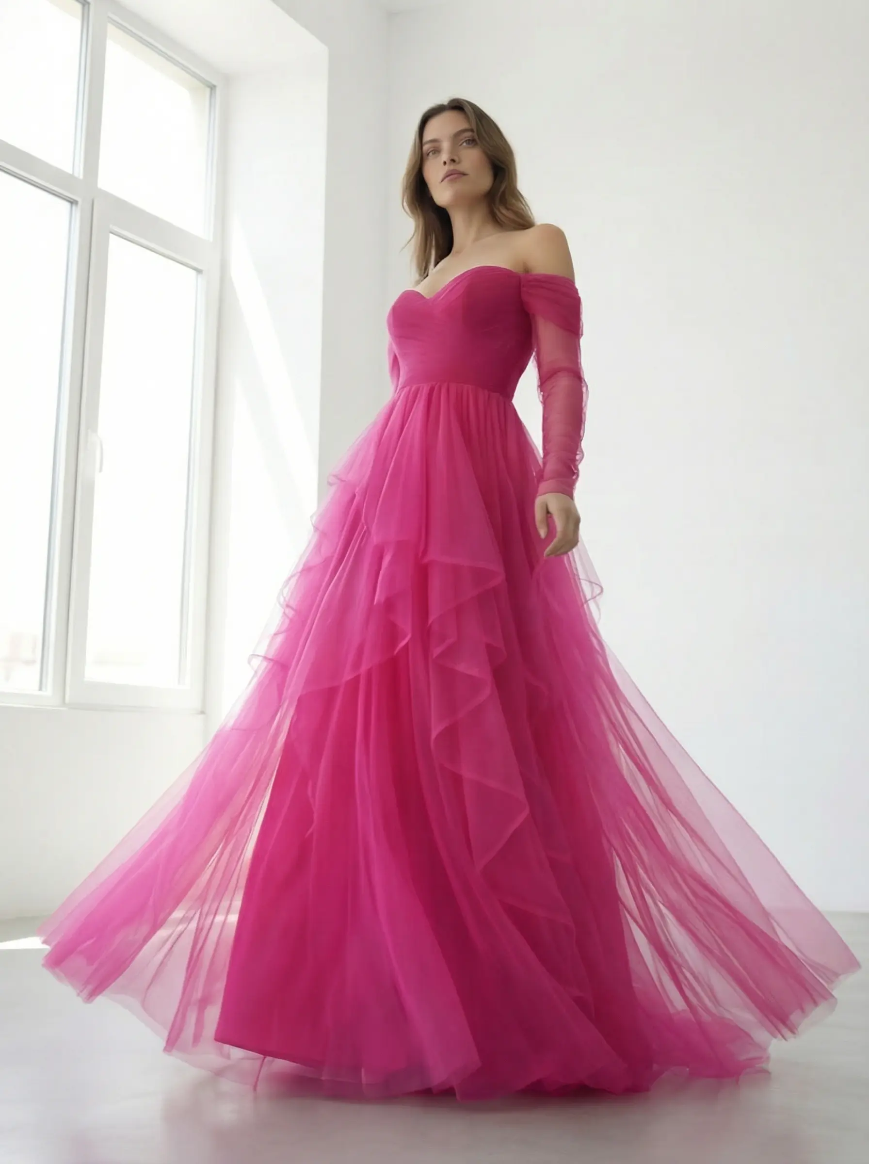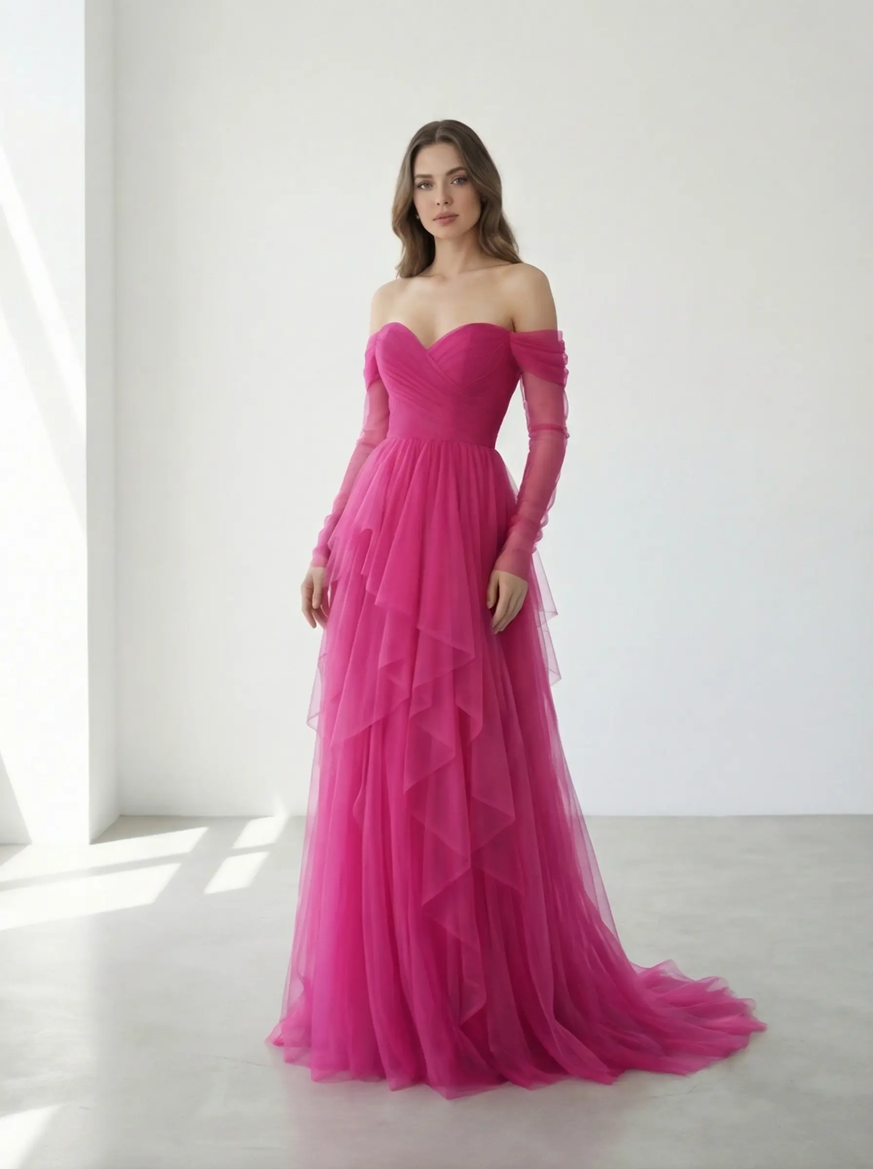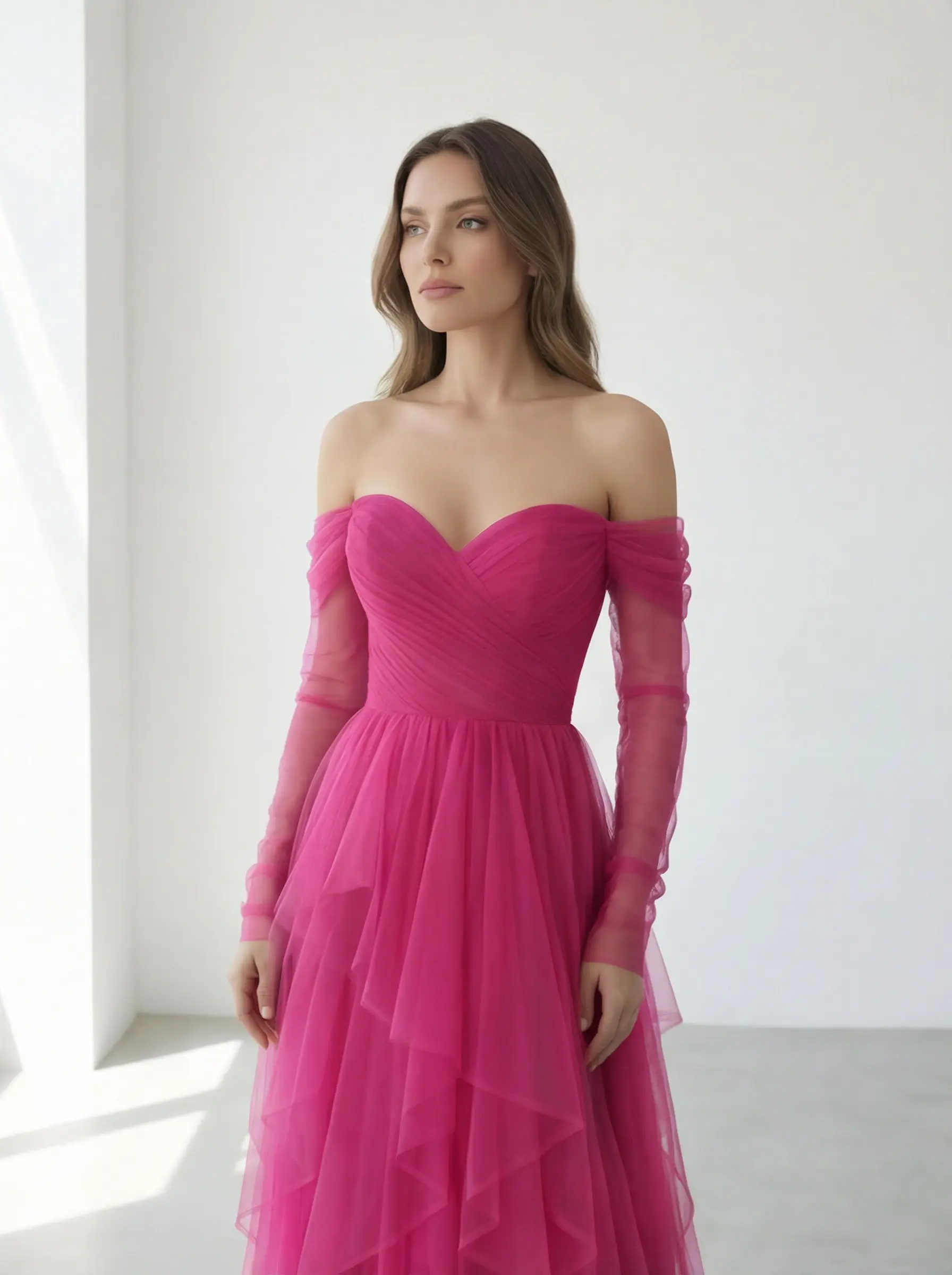 Escote corazón strapless estructurado con hombros off-shoulder en tul translúcido y mangas largas etéreas.