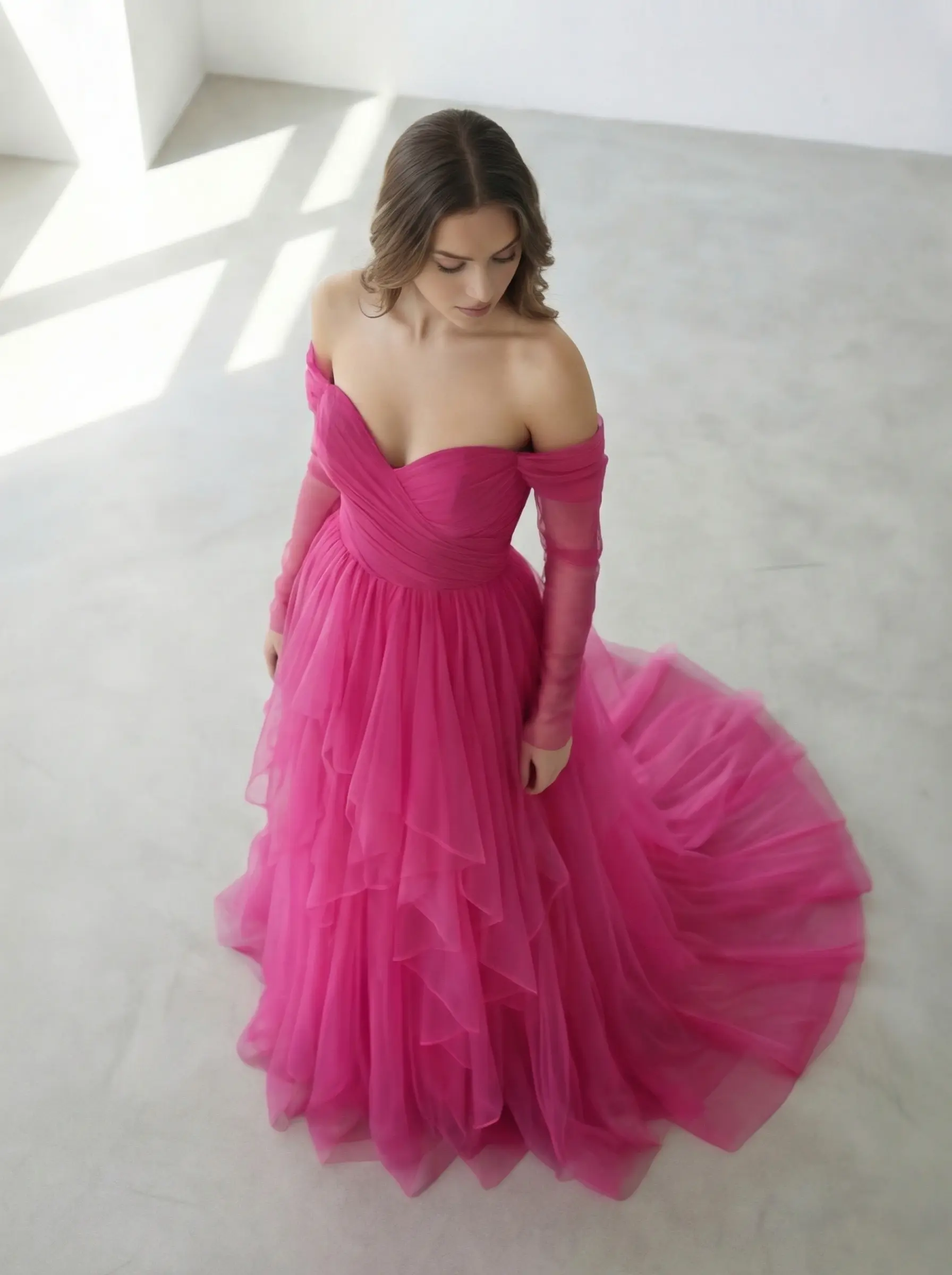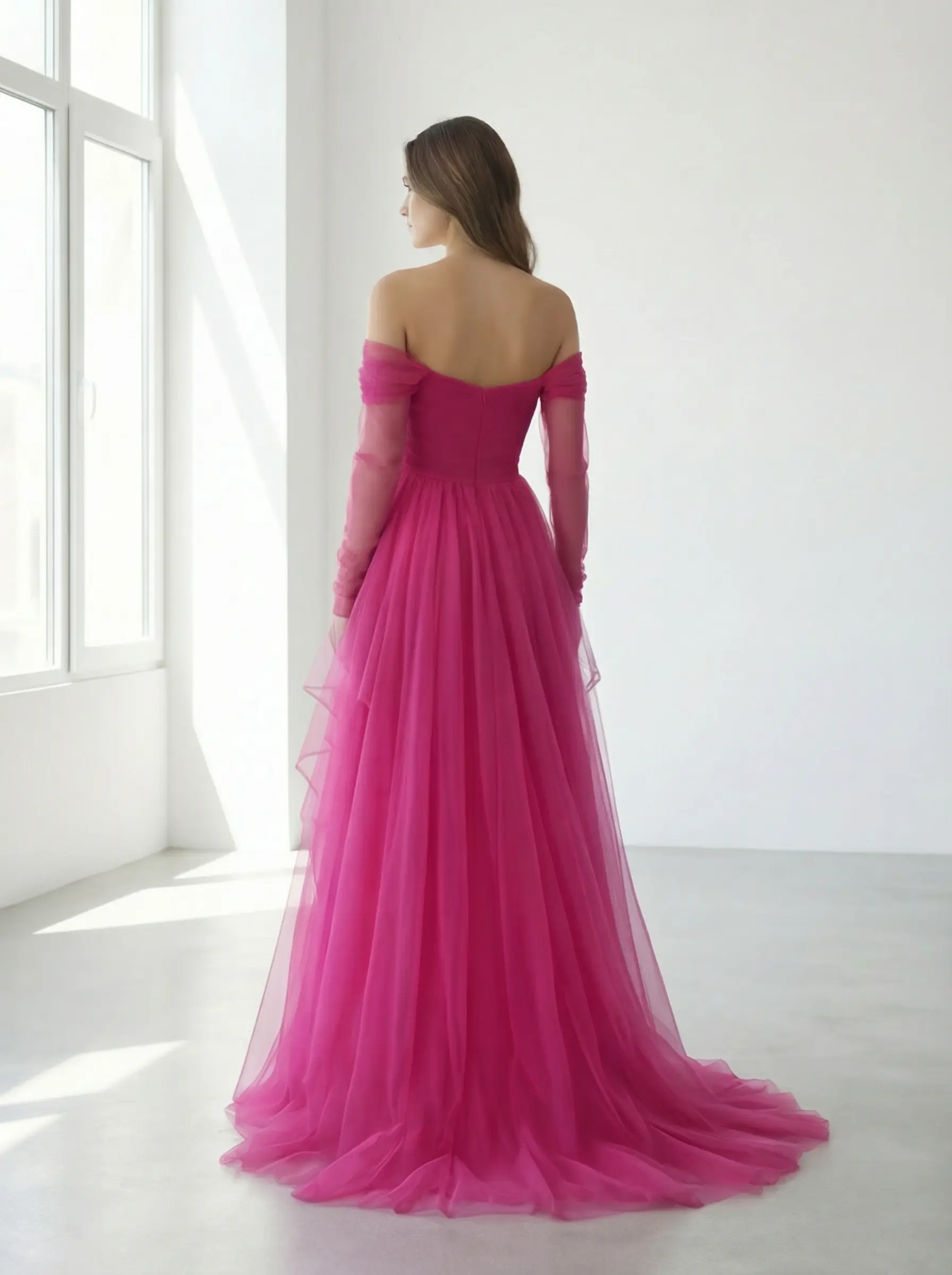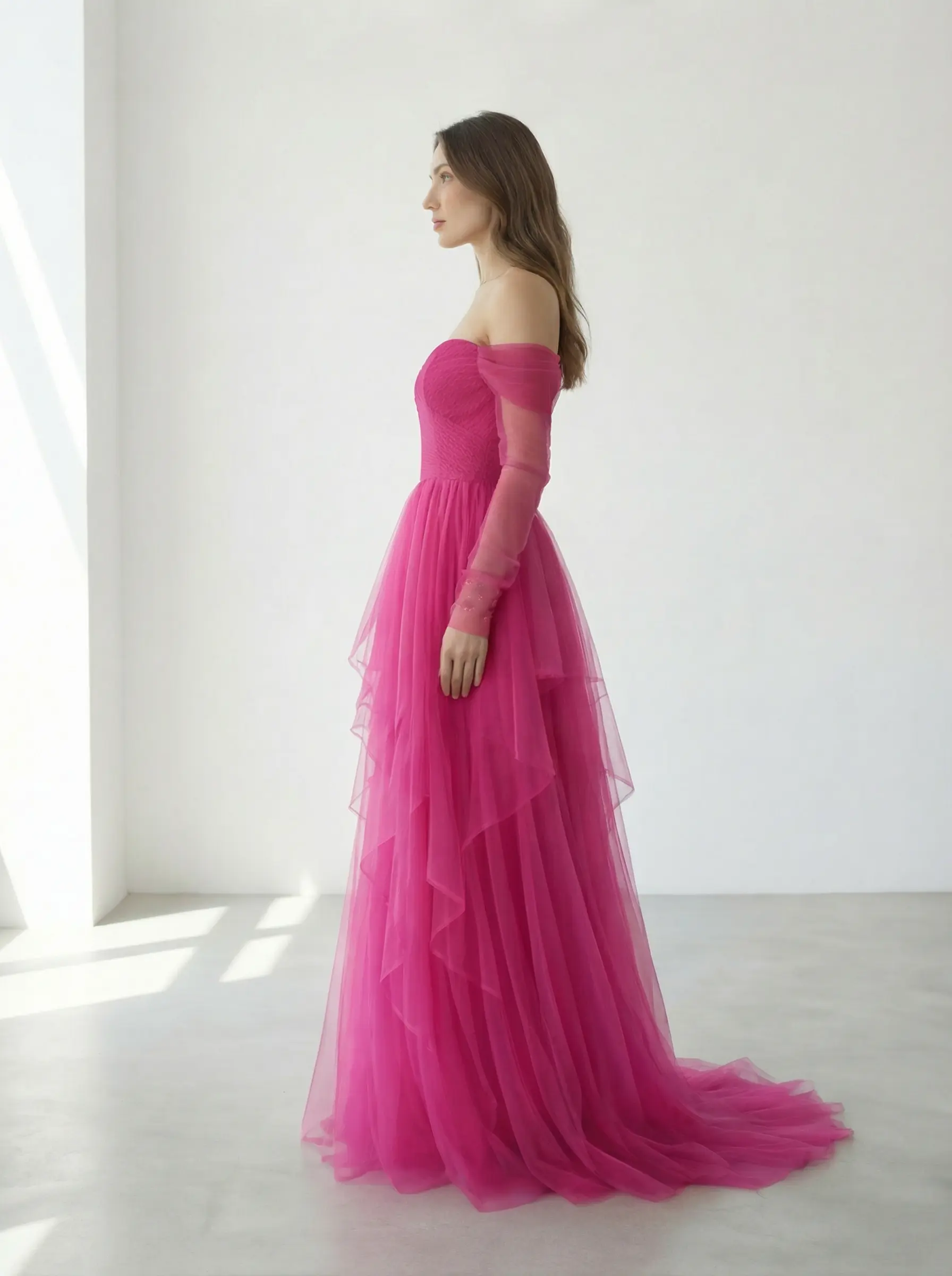 Escote corazón strapless estructurado con hombros off-shoulder en tul translúcido y mangas largas etéreas.