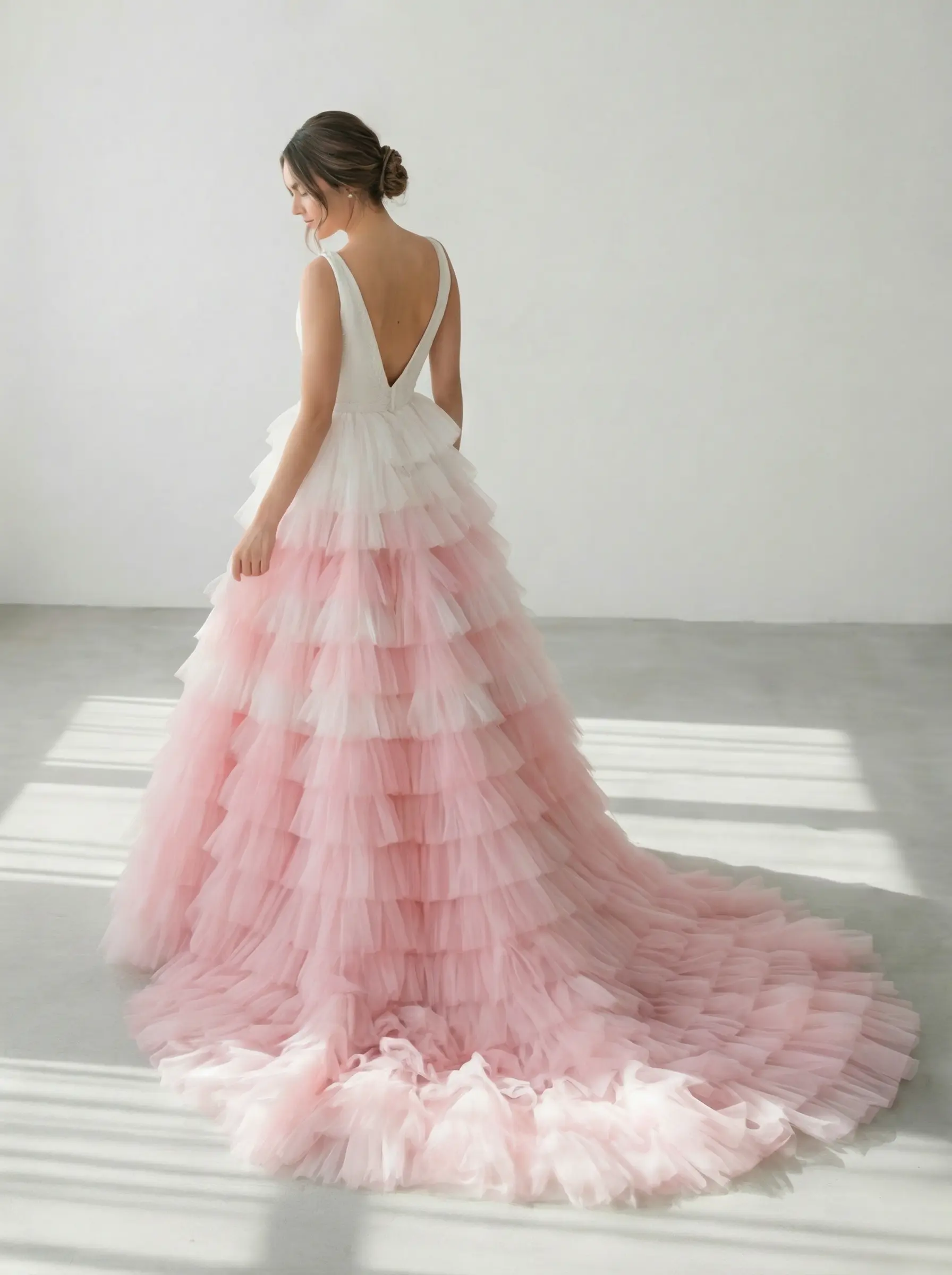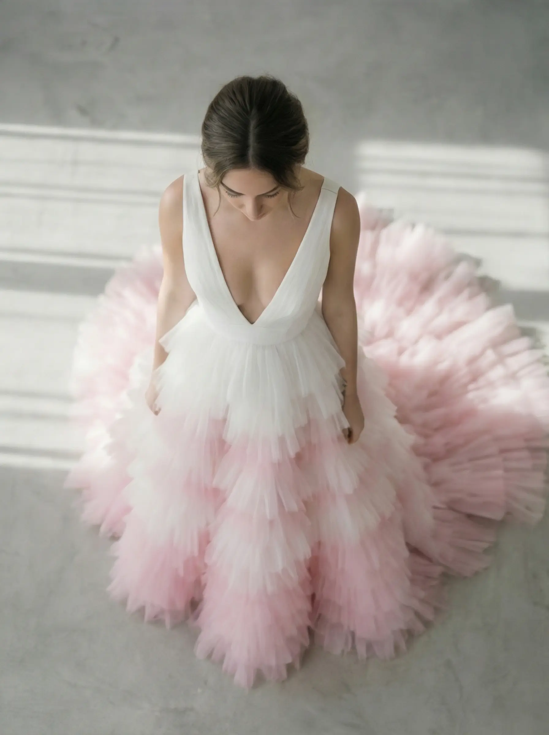 Cuerpo liso estructurado con soporte interno para definición de cintura. Falda compuesta por múltiples capas fruncidas de tul en degradado progresivo para volumen extremo y efecto etéreo. Cierre posterior invisible.