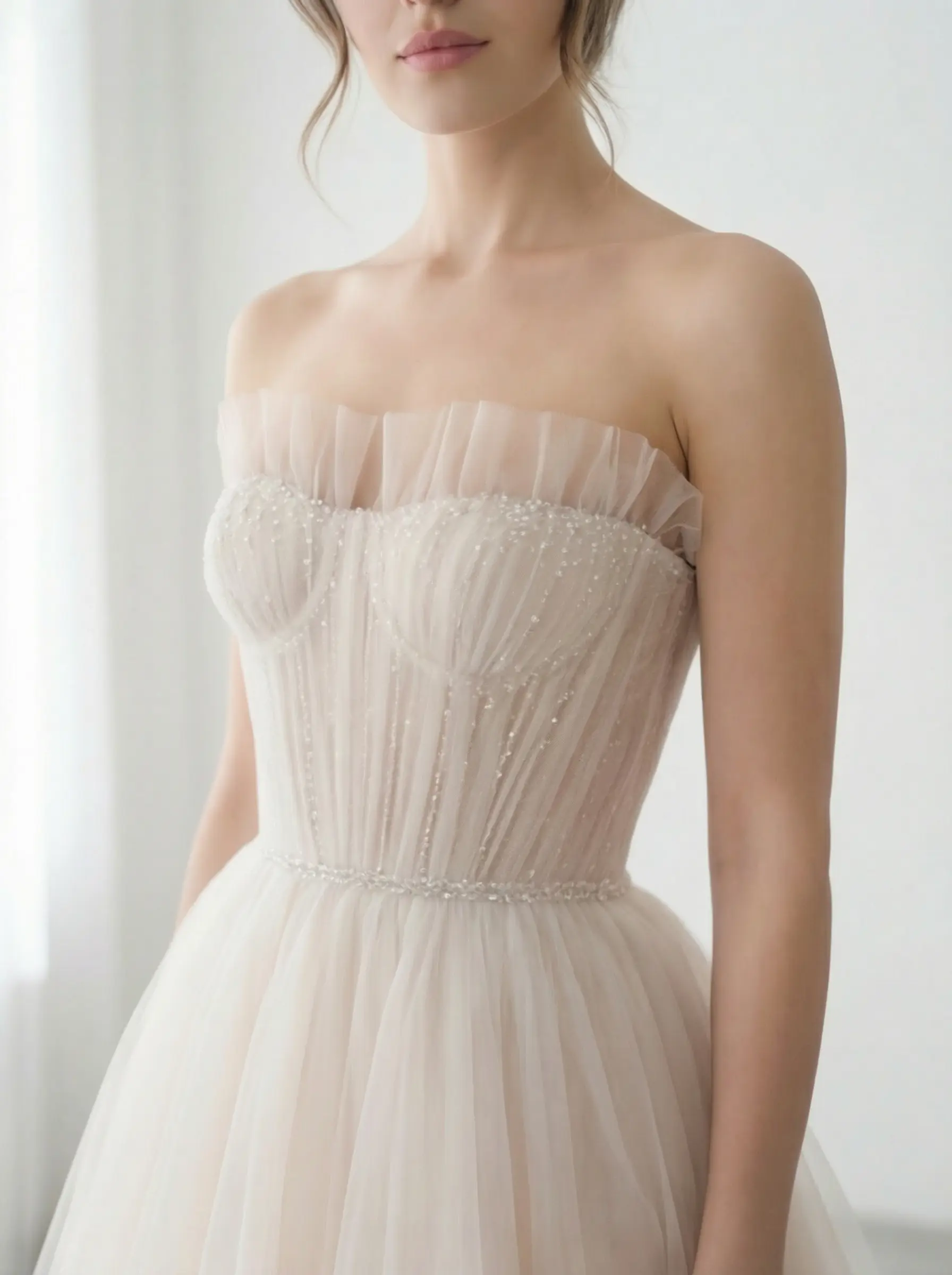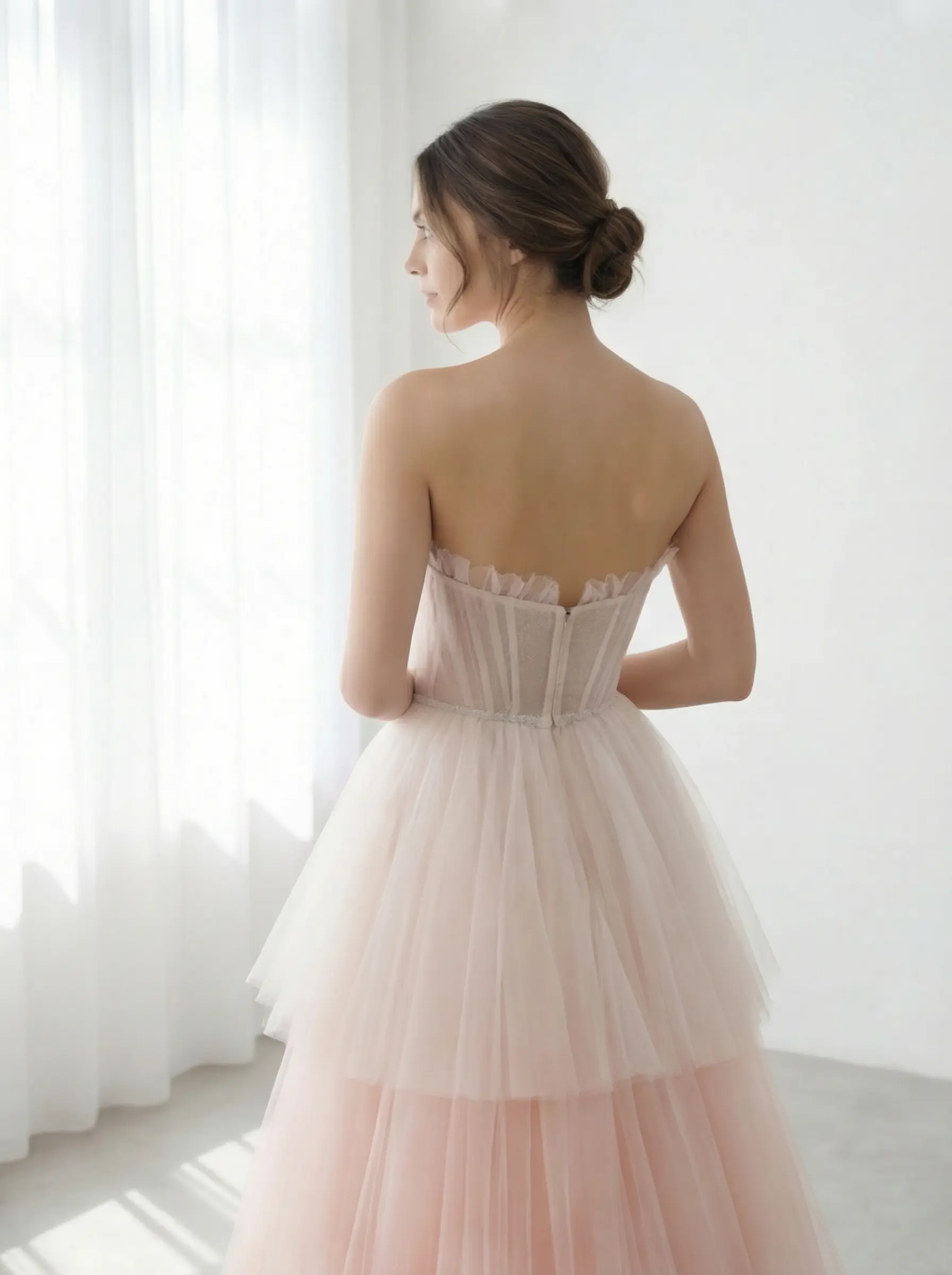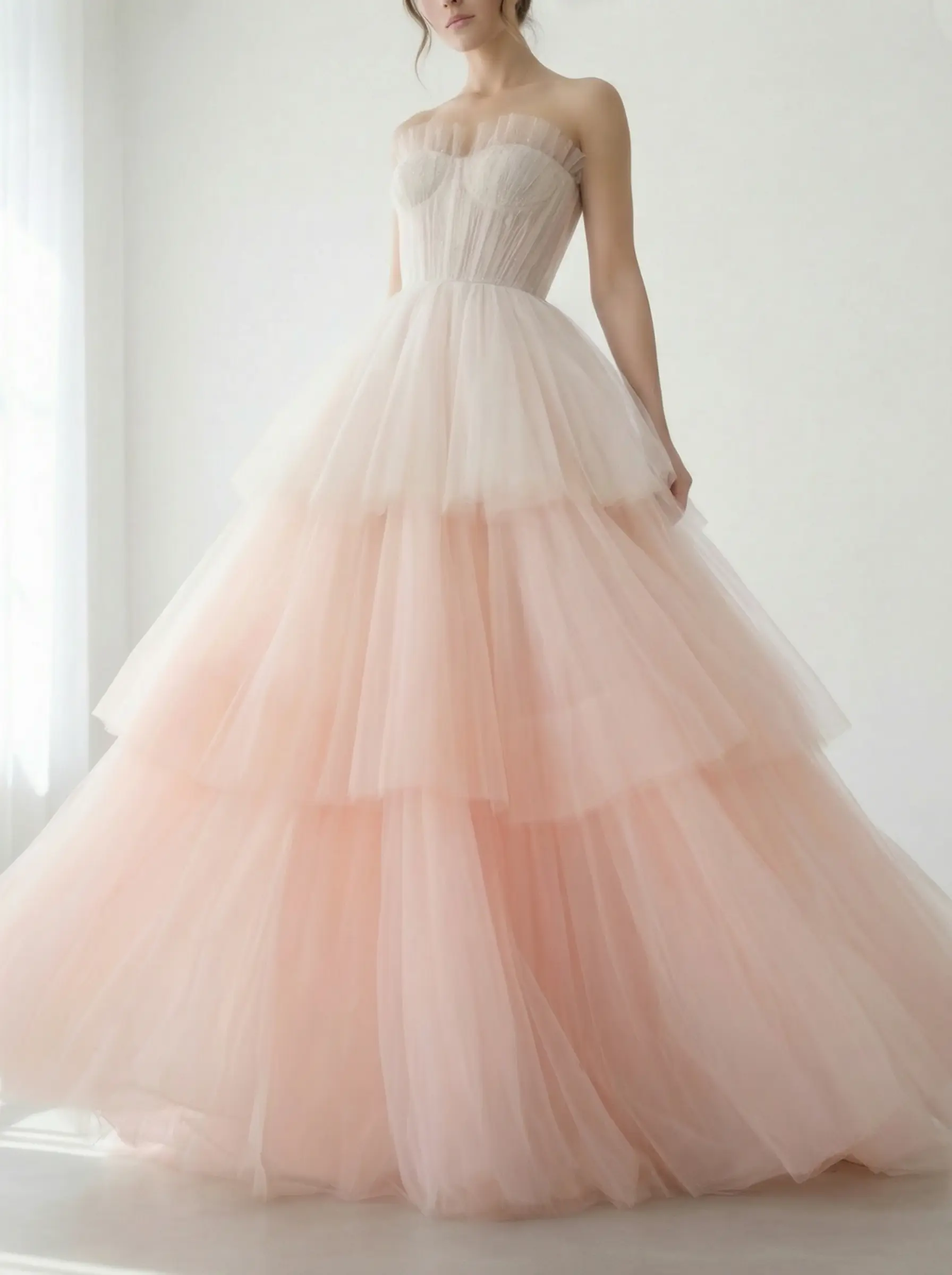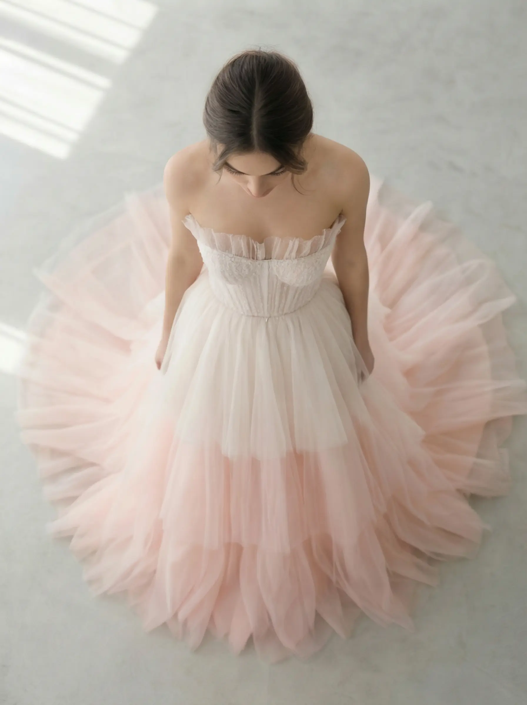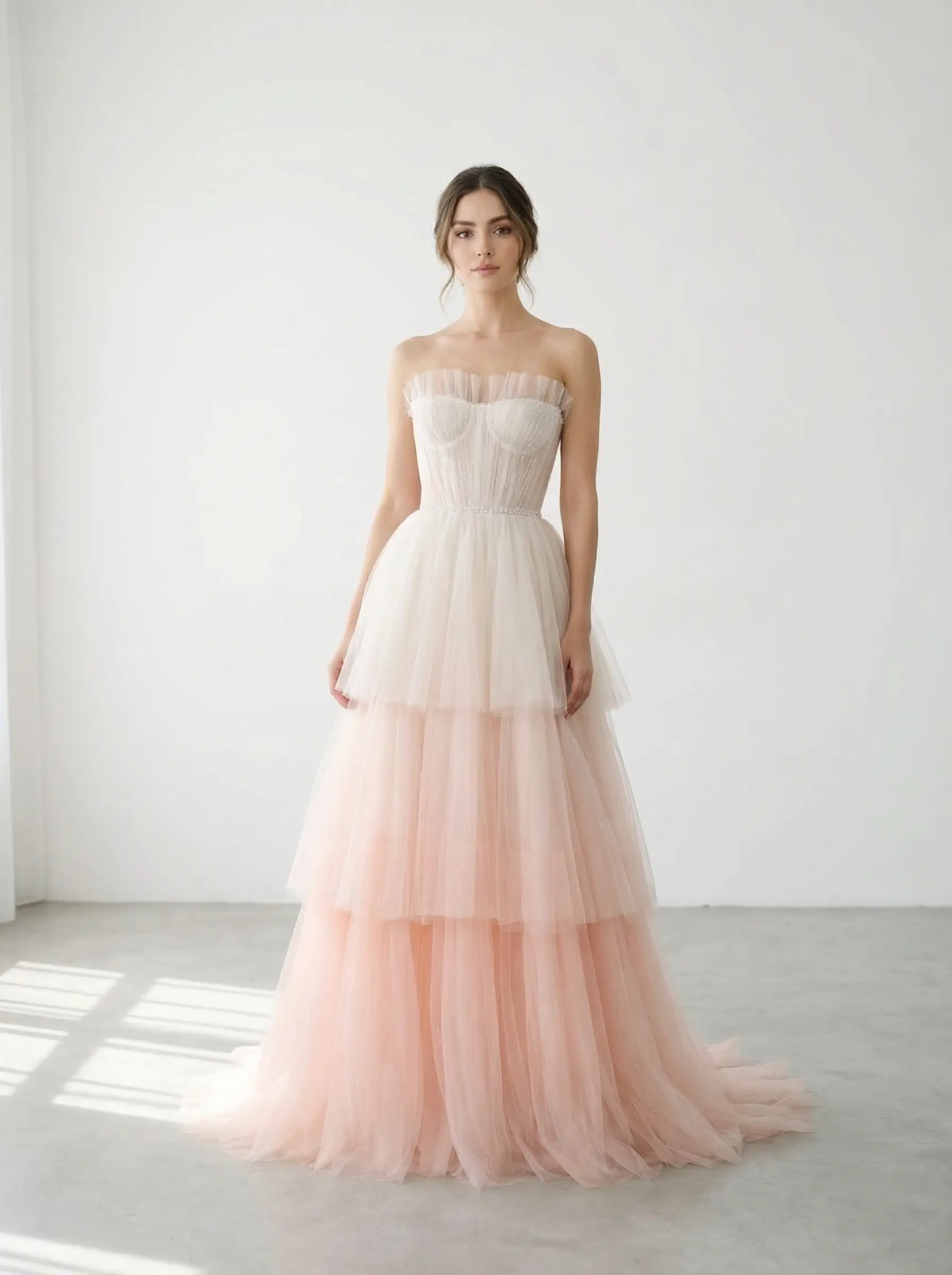 Cuerpo tipo corset con varillas internas para definición de cintura. Falda compuesta por múltiples capas de tul ligero en degradado progresivo para volumen fluido y efecto etéreo. Cierre posterior invisible.